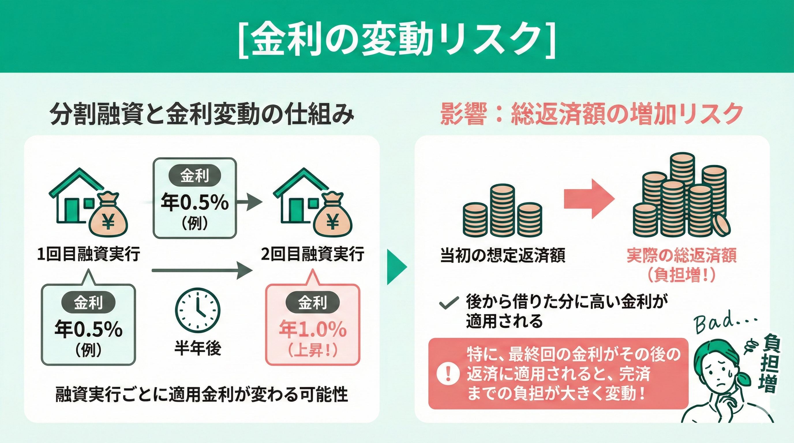 金融機関や契約内容によっては、初回融資時の金利が全借入期間に適用されるケースもありますが、そうでない場合は金利動向に左右されます。例えば、1回目の融資実行時には年0.5%だった金利が、半年後の2回目融資時には年1.0%に上昇していたとします。