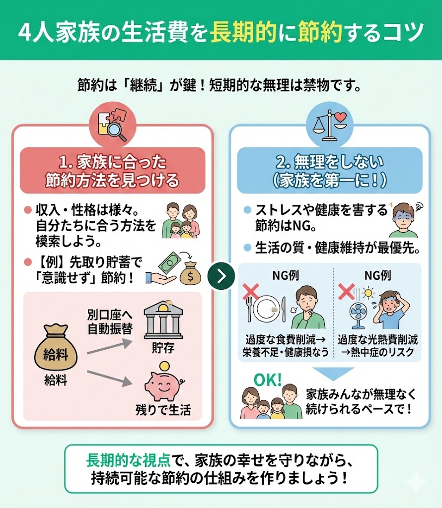 - 4人家族の生活費を長期的に節約するコツ