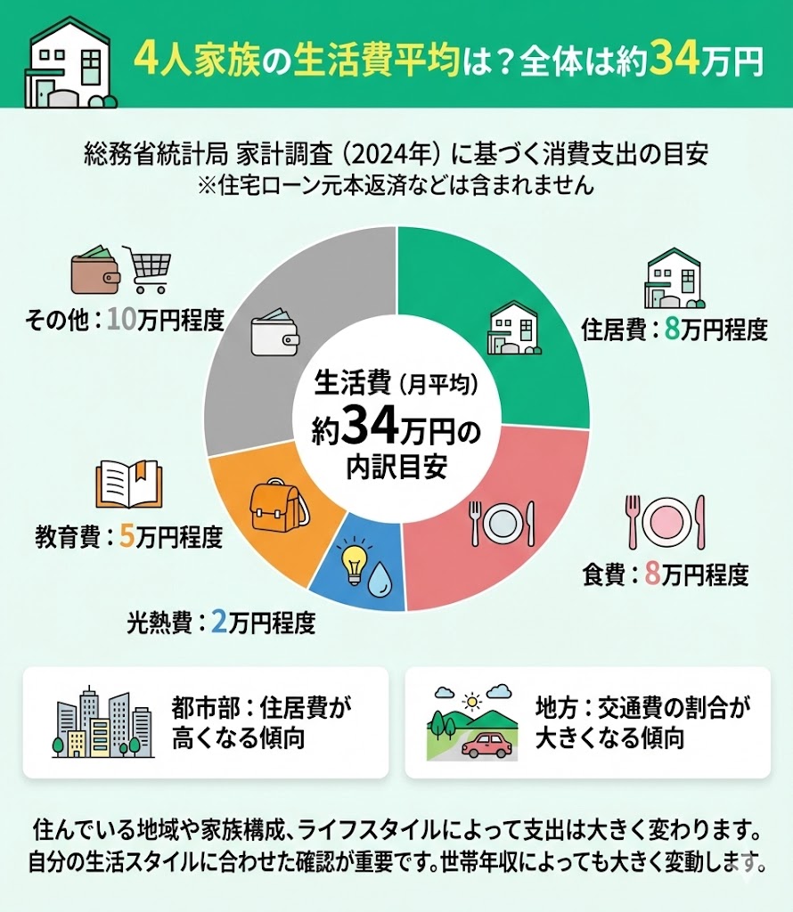総務省統計局の家計調査(2024年)によると、4人家族の生活費(消費支出)は月々平均で約34万円前後が目安です。