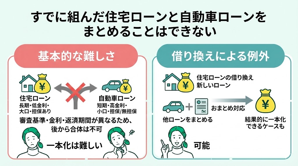 すでに組んだ住宅ローンと自動車ローンをまとめることは、同一契約のまま後から一本化する形では基本的に難しいです。
