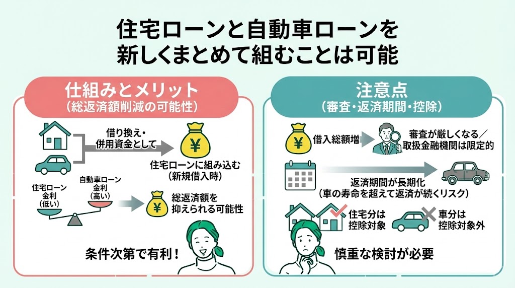 住宅ローンと自動車ローン(マイカーローン)を一つにまとめることができるかどうかについて、以下の点を解説します。