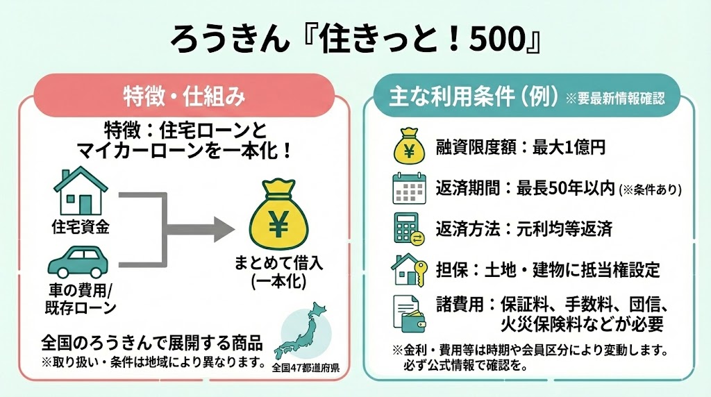 住宅ローンとマイカーローンをまとめて利用できる商品として、まずご紹介するのが、ろうきん「住きっと!500」(※取り扱い・商品名・条件は地域のろうきんにより異なる場合があります)です。