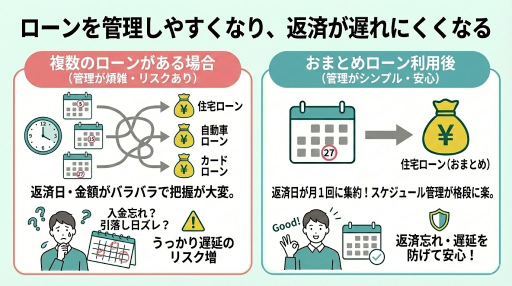 - ローンを管理しやすくなり、返済が遅れにくくなる