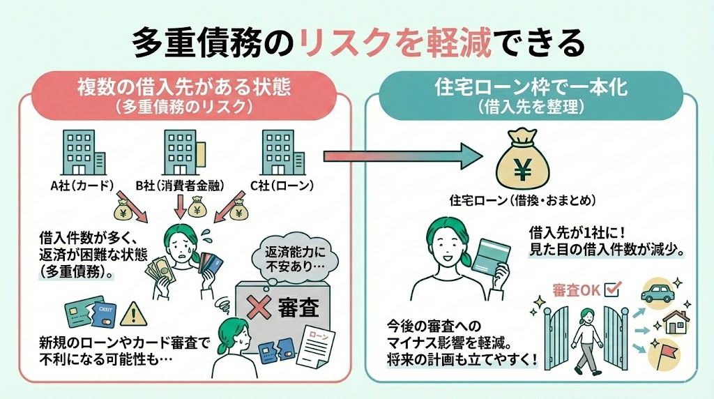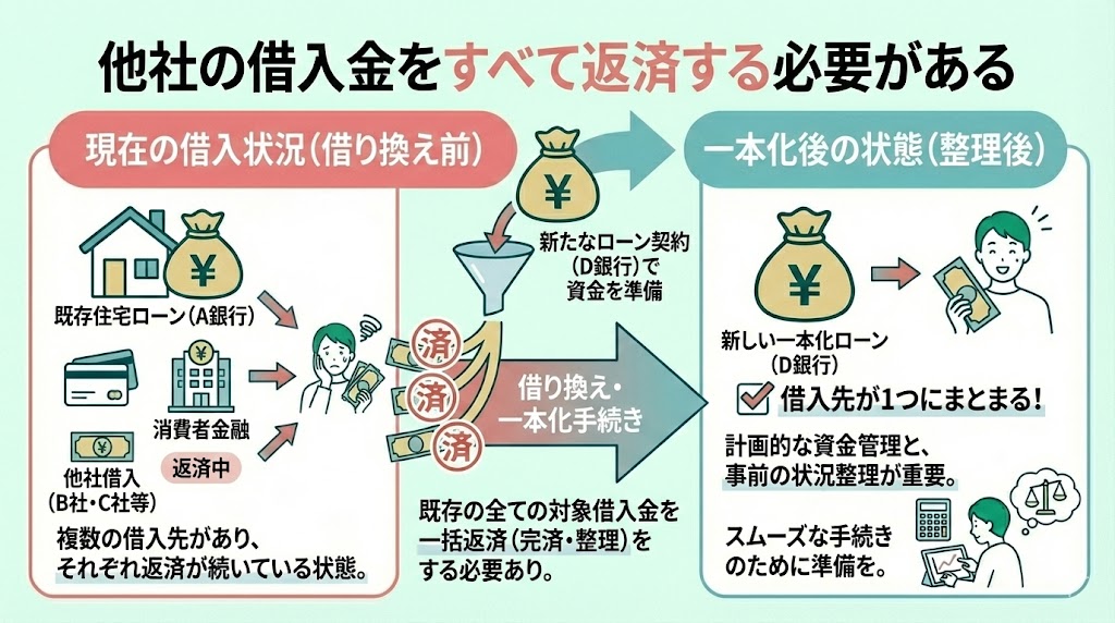 一方で、金融機関や商品によっては、住宅ローンの借り換えと同時に他ローンをまとめられる(おまとめ対応・多目的併用型)ことで、結果的に一本化できるケースもあります。