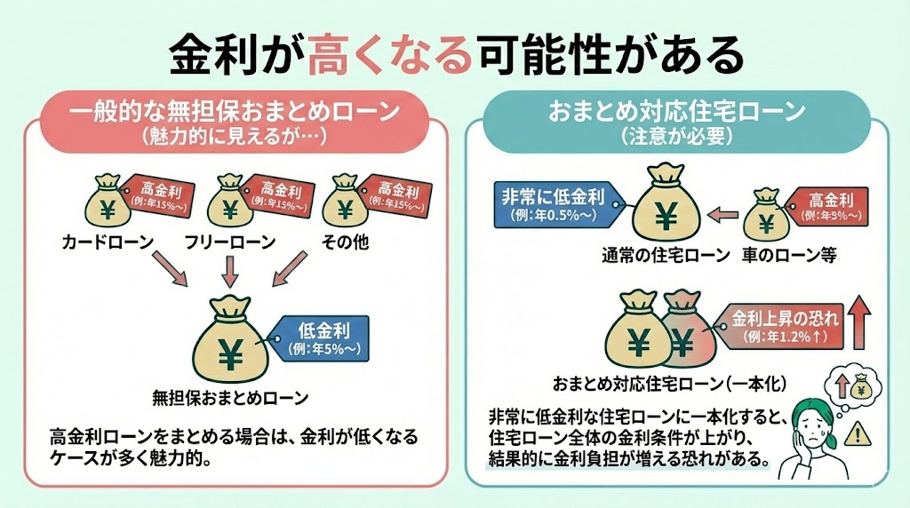 「おまとめ対応(多目的併用型)の住宅ローン」のデメリットとしてまず挙げられるのは、金利が高くなる可能性があることです。