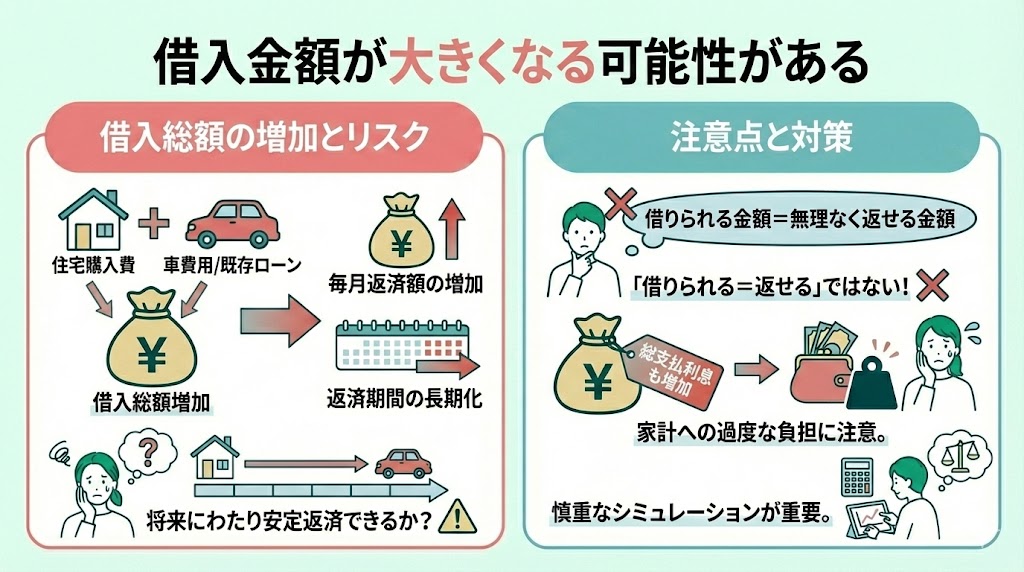 住宅購入費に加えて車の購入費用や(商品によっては)既存の自動車ローンの借換資金も住宅ローンに含めるため、借入総額は大きくなる可能性があります。