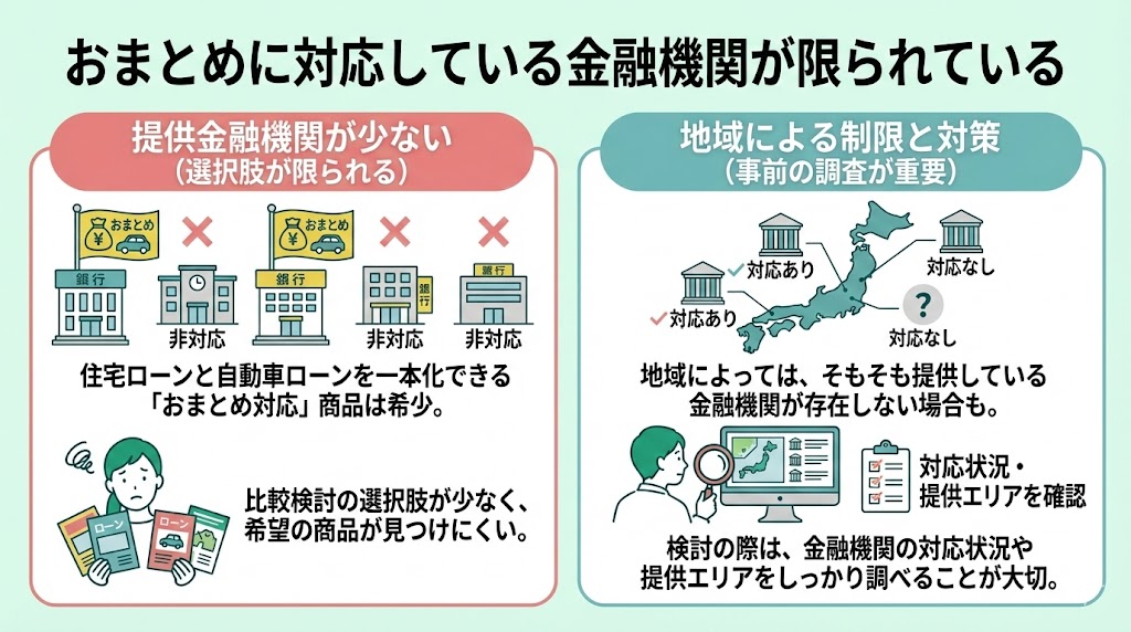 4つ目のデメリットは、住宅ローンと自動車ローンを同時にまとめられる金融機関が少ないことです。