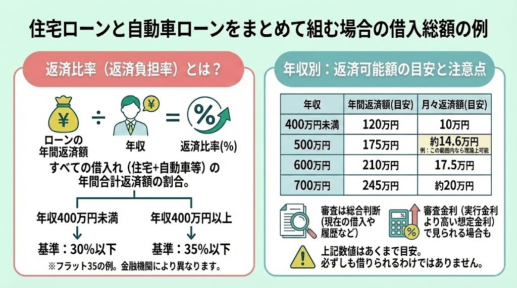 この範囲内で住宅ローンと自動車ローンの合計返済額が収まっていれば、理論上、併用して借り入れることは可能です。