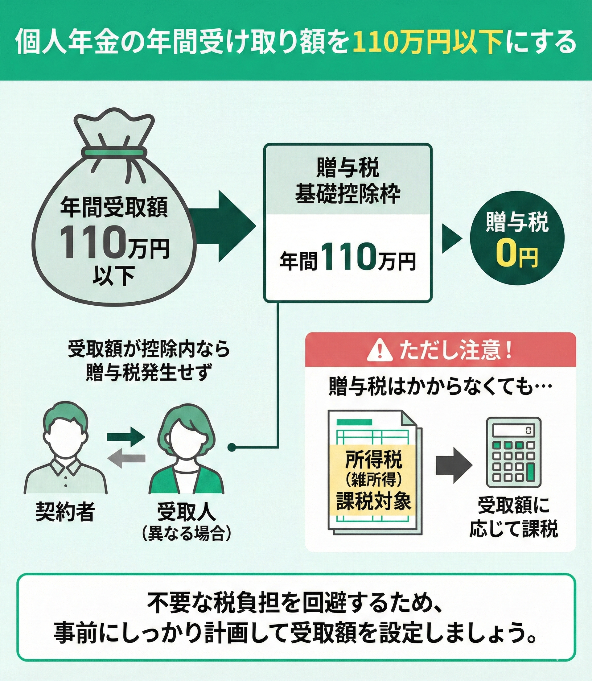 ただし、贈与税がかからなくても、年金受取額に応じて所得税(雑所得)が課税される点には注意が必要です。