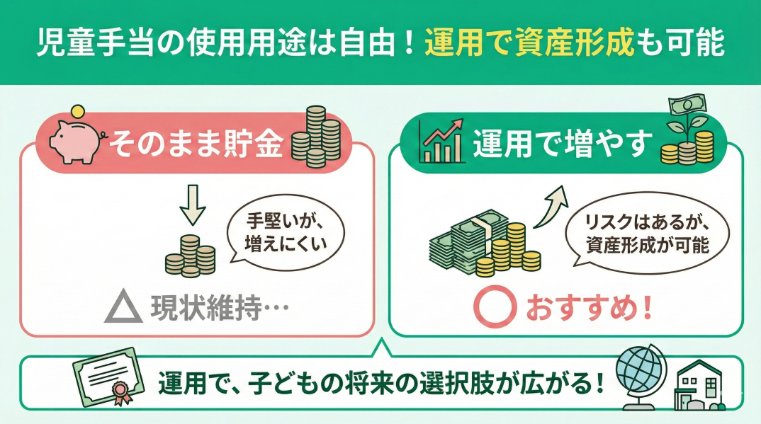また、手当をそのまま貯金するだけでなく、運用することで資産をさらに増やすこともおすすめです。