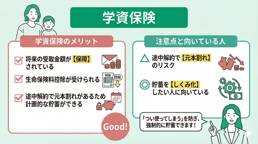 おすすめ運用方法の2つ目は、学資保険で教育資金を貯める方法で、メリットとして以下3つあります。