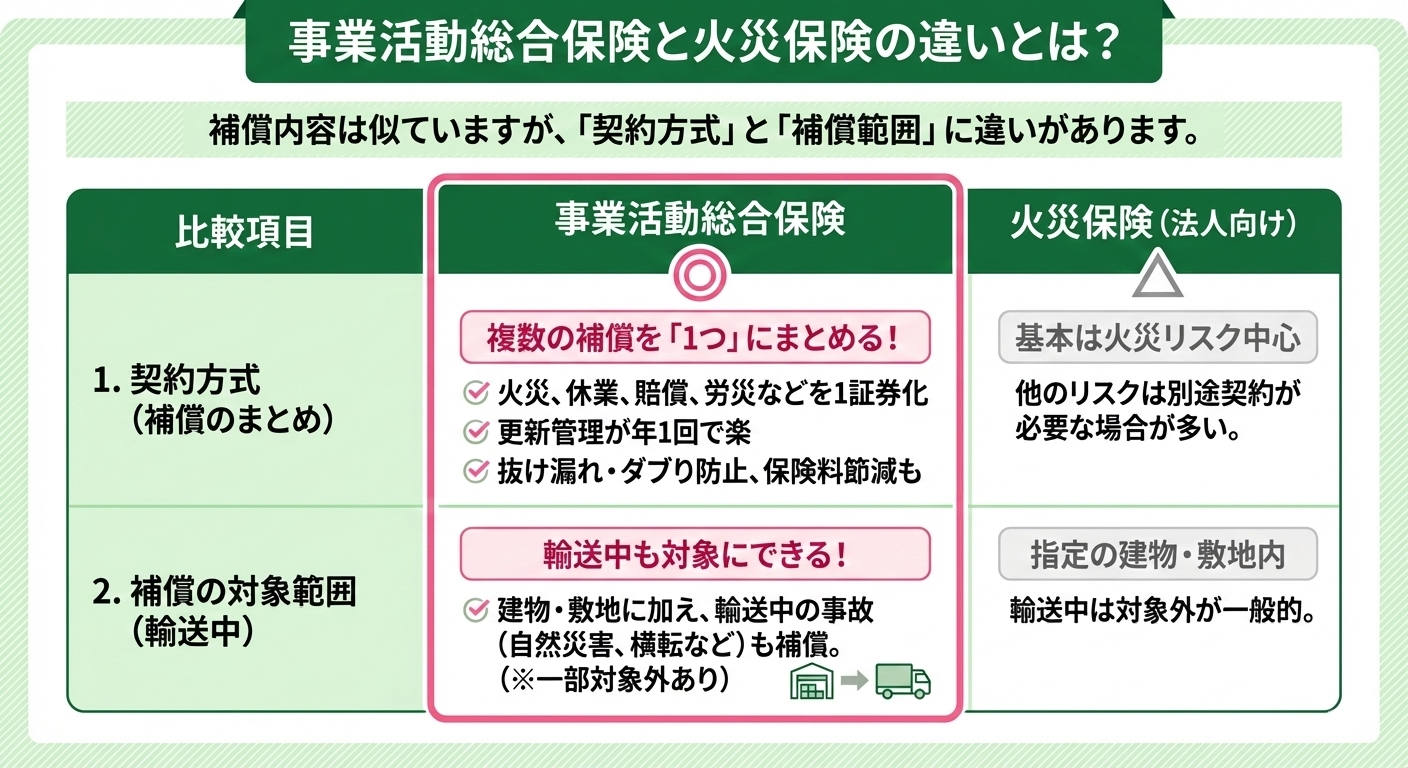事業活動総合保険と火災保険の補償内容には大きな違いはありません。しかし、契約方式と補償の対象とできる範囲に多少違いがあります。