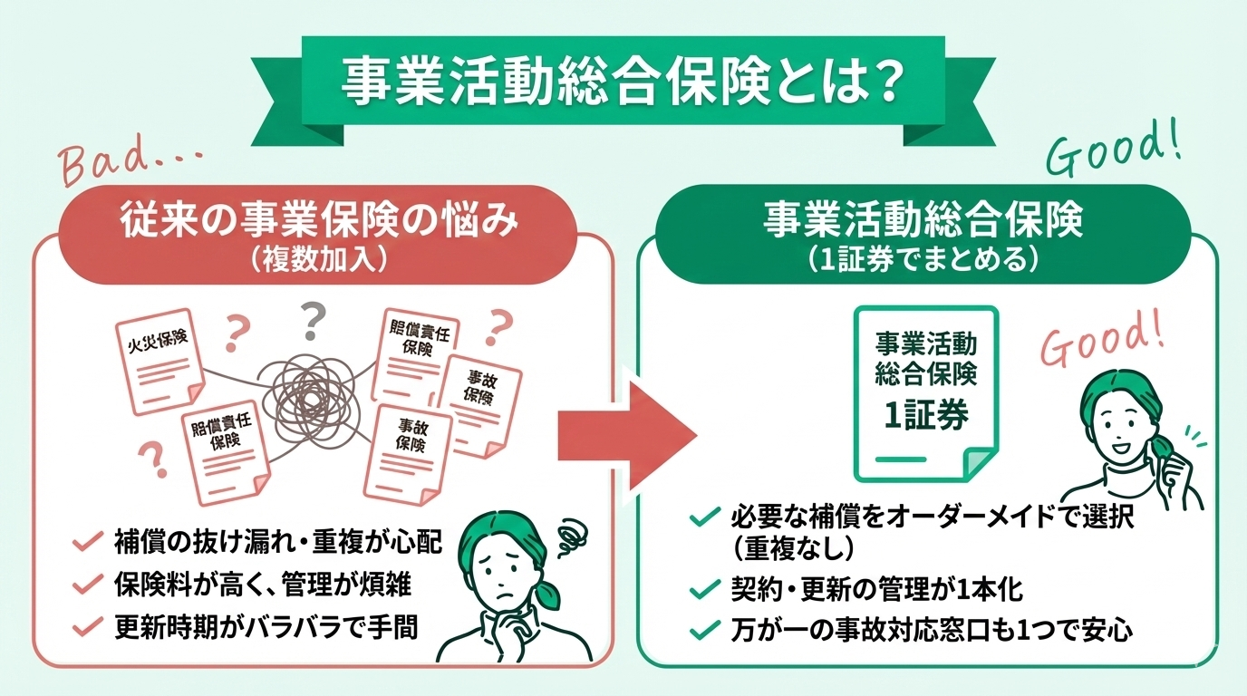 事業活動総合保険とは、複数の補償をまとめて加入できるため、補償の重複を防ぐだけでなく、必要な補償だけを選択して加入できるため、オーダーメイドが可能な保険商品になっています。