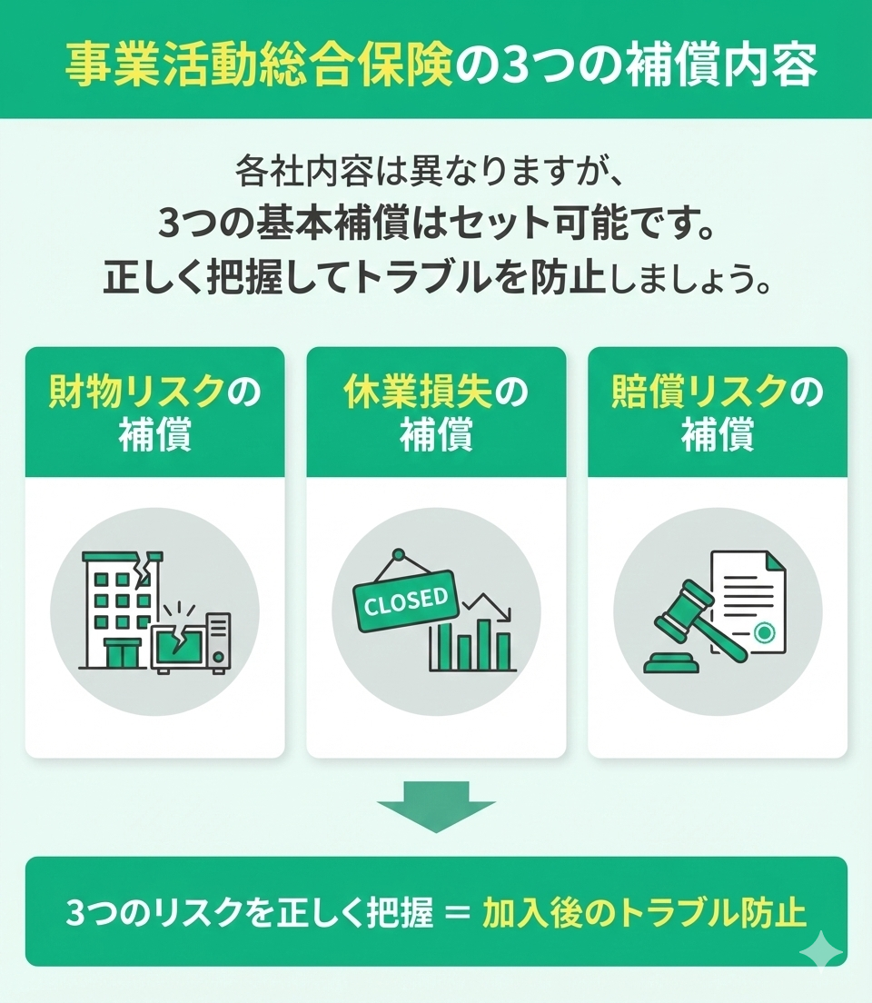 この記事では、事業リスクに備えるために知っておくべき、事業活動総合保険の概要、具体的な「3つの補償内容」、そして気になる「保険料の相場と加入方法」までを徹底的に解説します。