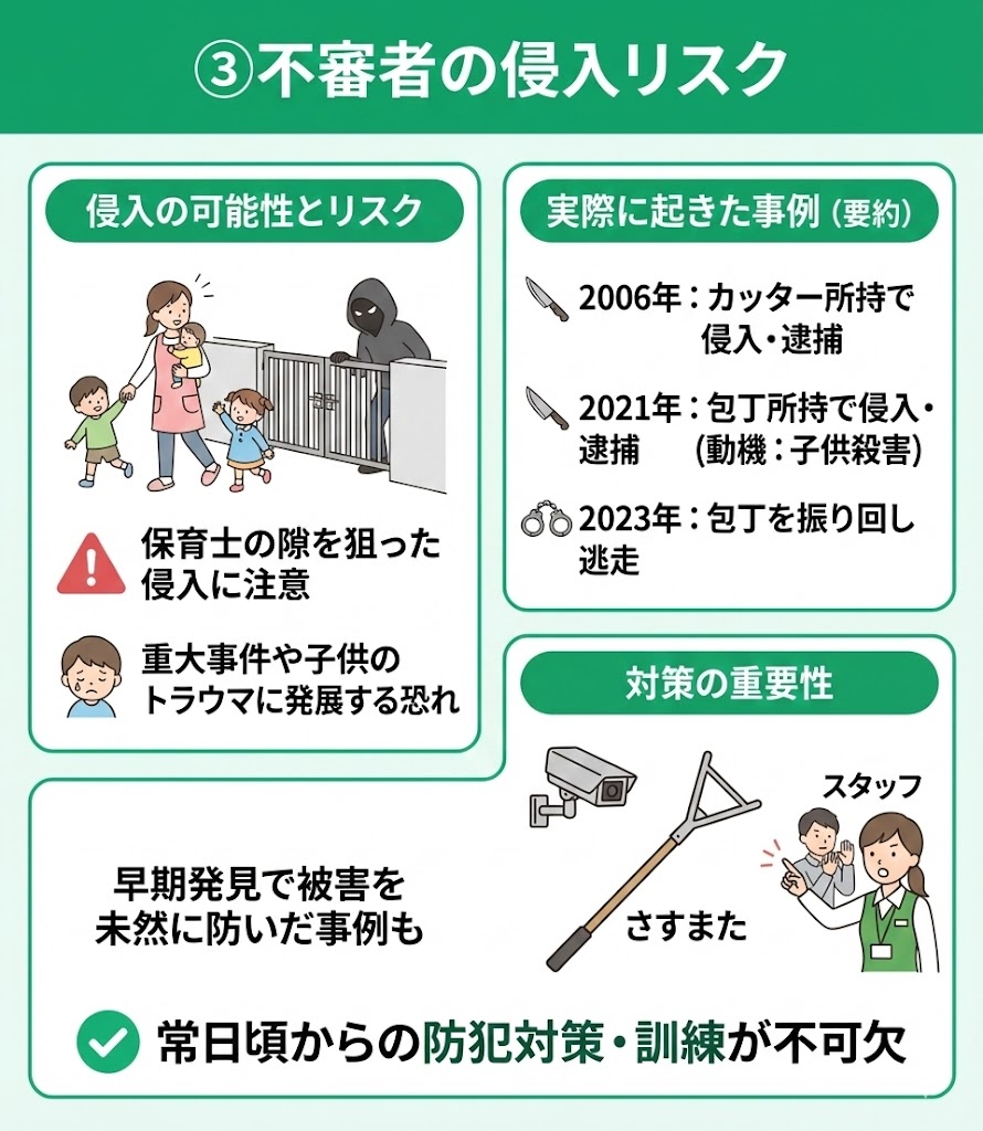 - 2006年、カッターナイフを持った男性が保育園に侵入・逮捕
