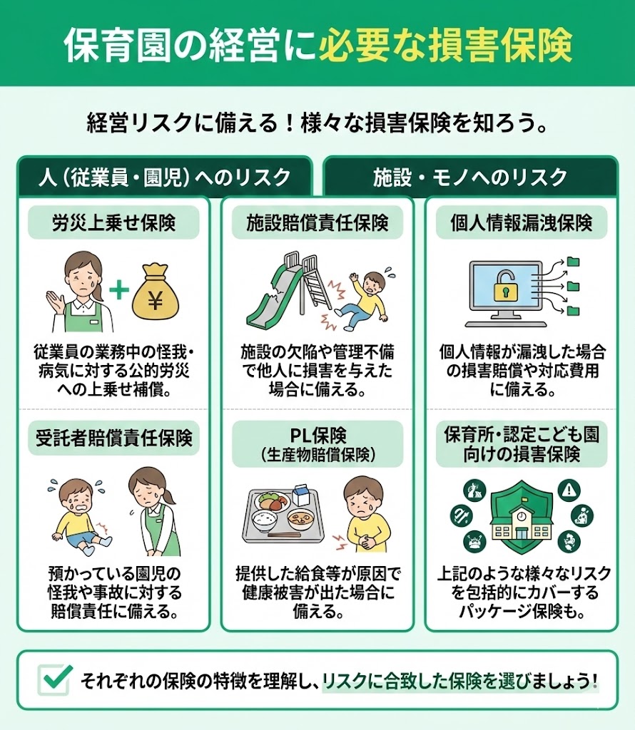 保育園や託児所では、子供の安全が第一優先ですが、万が一の損害賠償に備えて、損害保険への加入も視野に入れておくべきです。