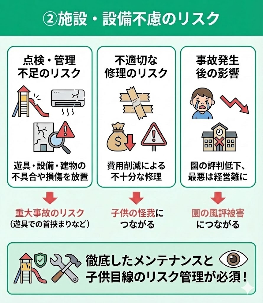 施設や設備のメンテナンス、子供目線の危険リスクを徹底して管理しなければなりません。