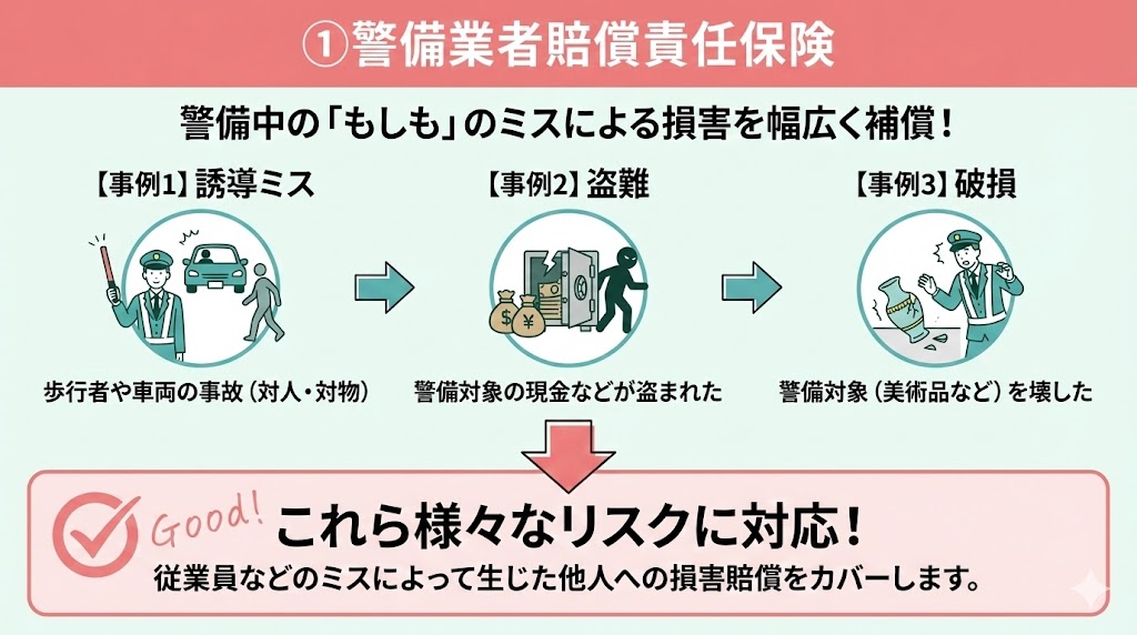 従業員などが警備中にミスをおかしてしまい、他人を怪我させてしまったり、ものを壊してしまった場合に補償する保険です。