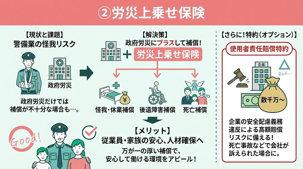 これらのように、警備業は怪我だけでなく、死亡リスクが伴う業種であることから、労働災害保険にて、手厚く補償をすることは従業員だけでなく、その家族を守ることにも繋がります。