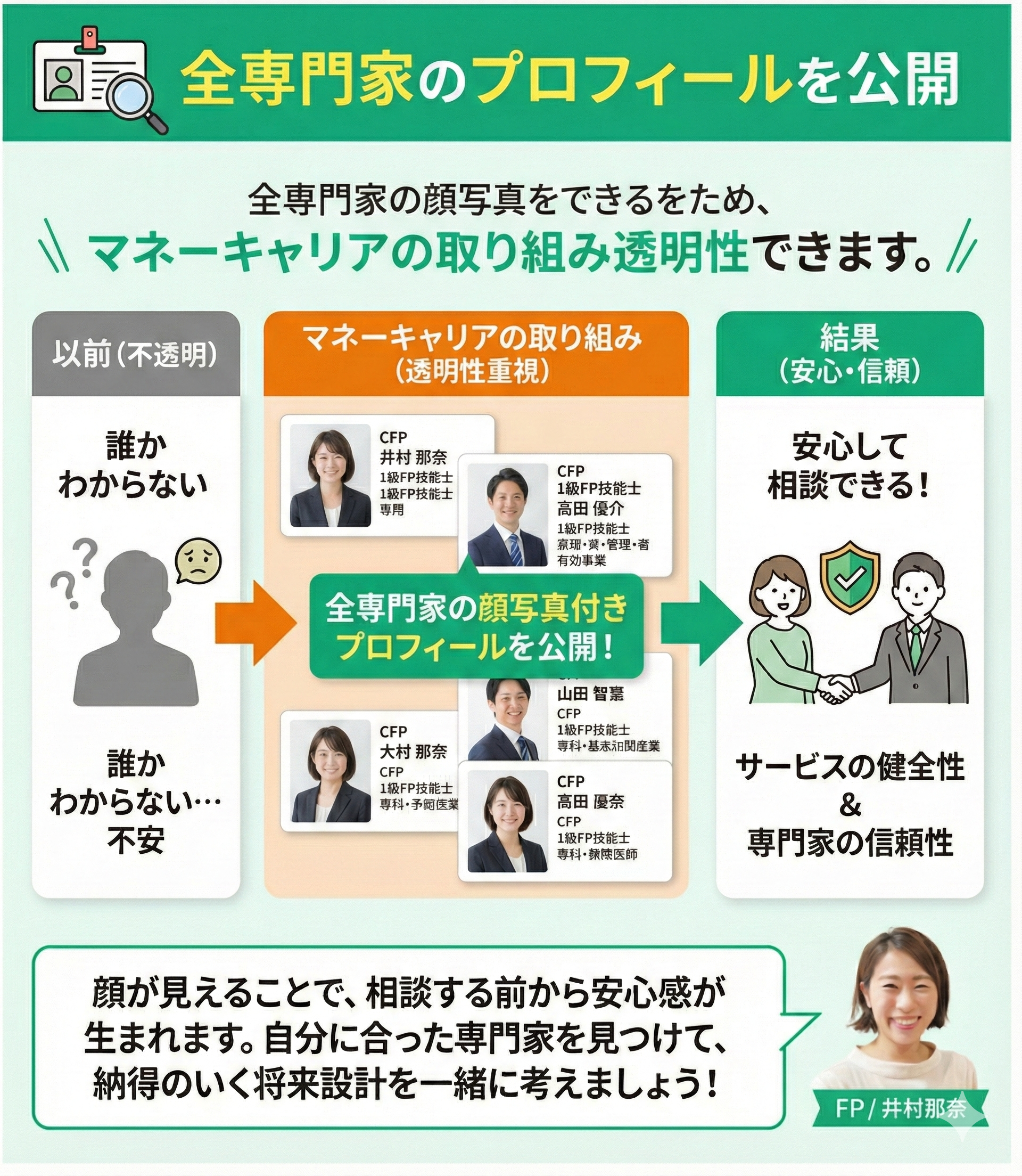 サービスの透明性を重視するマネーキャリアでは、ご相談いただくお客様に安心してご利用いただくため、すべての専門家について顔写真付きのプロフィールを公開しています。