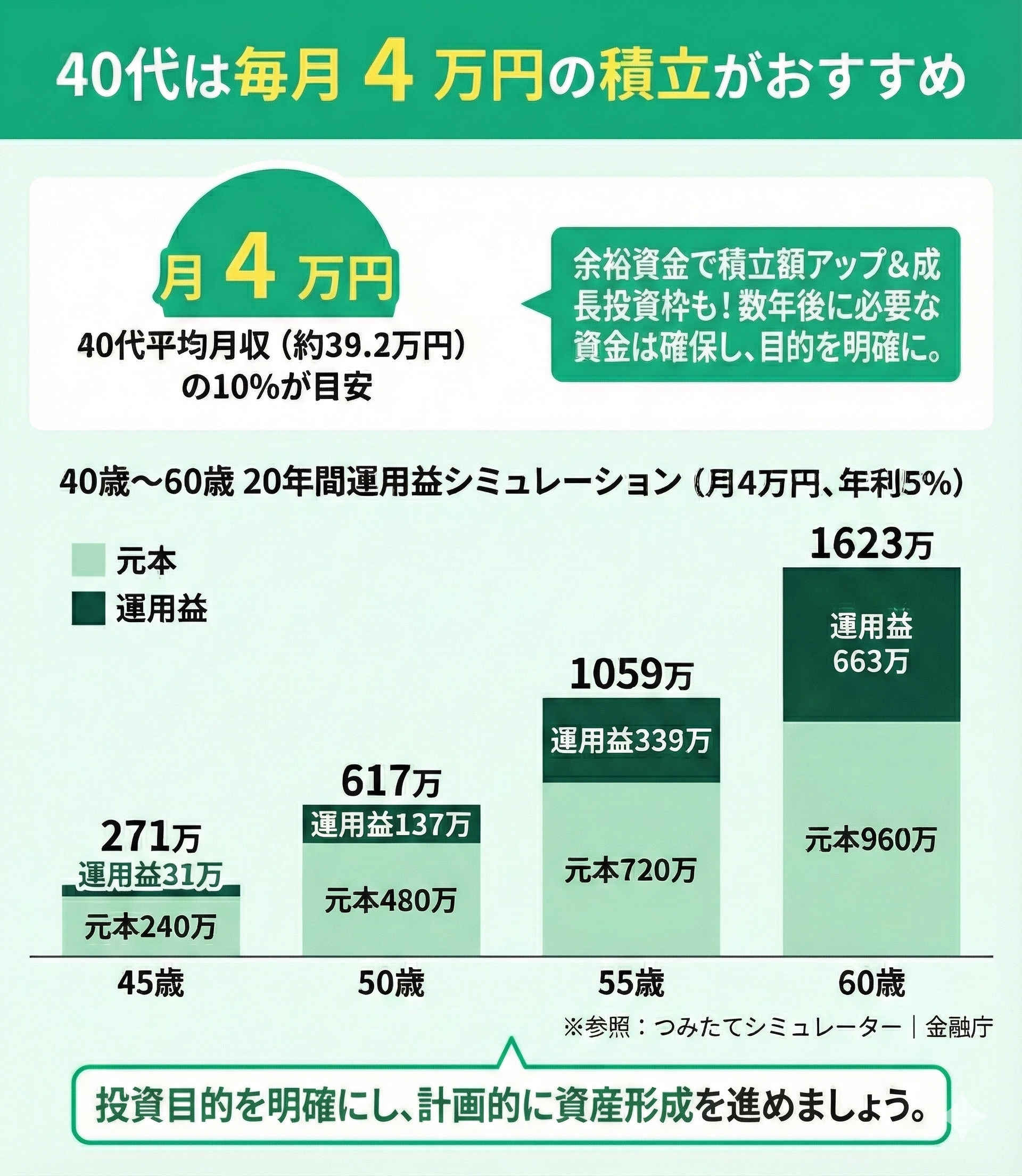 40代は、30代に比べて余裕資金が増えるため、毎月の積立額を増やし、資金に余裕がある場合は成長投資枠にも挑戦しましょう。