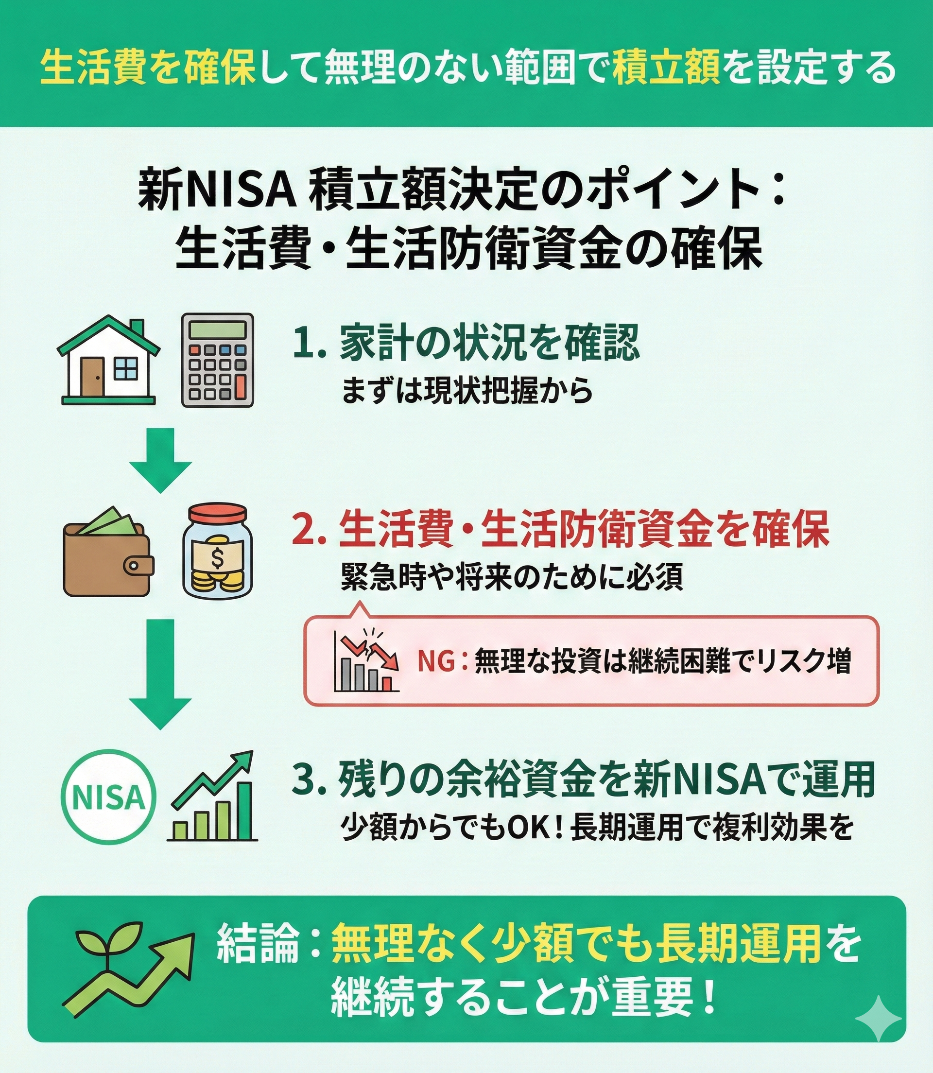 新NISAで毎月いくら積立するか決める際のポイントとしては以下3つが挙げられます。