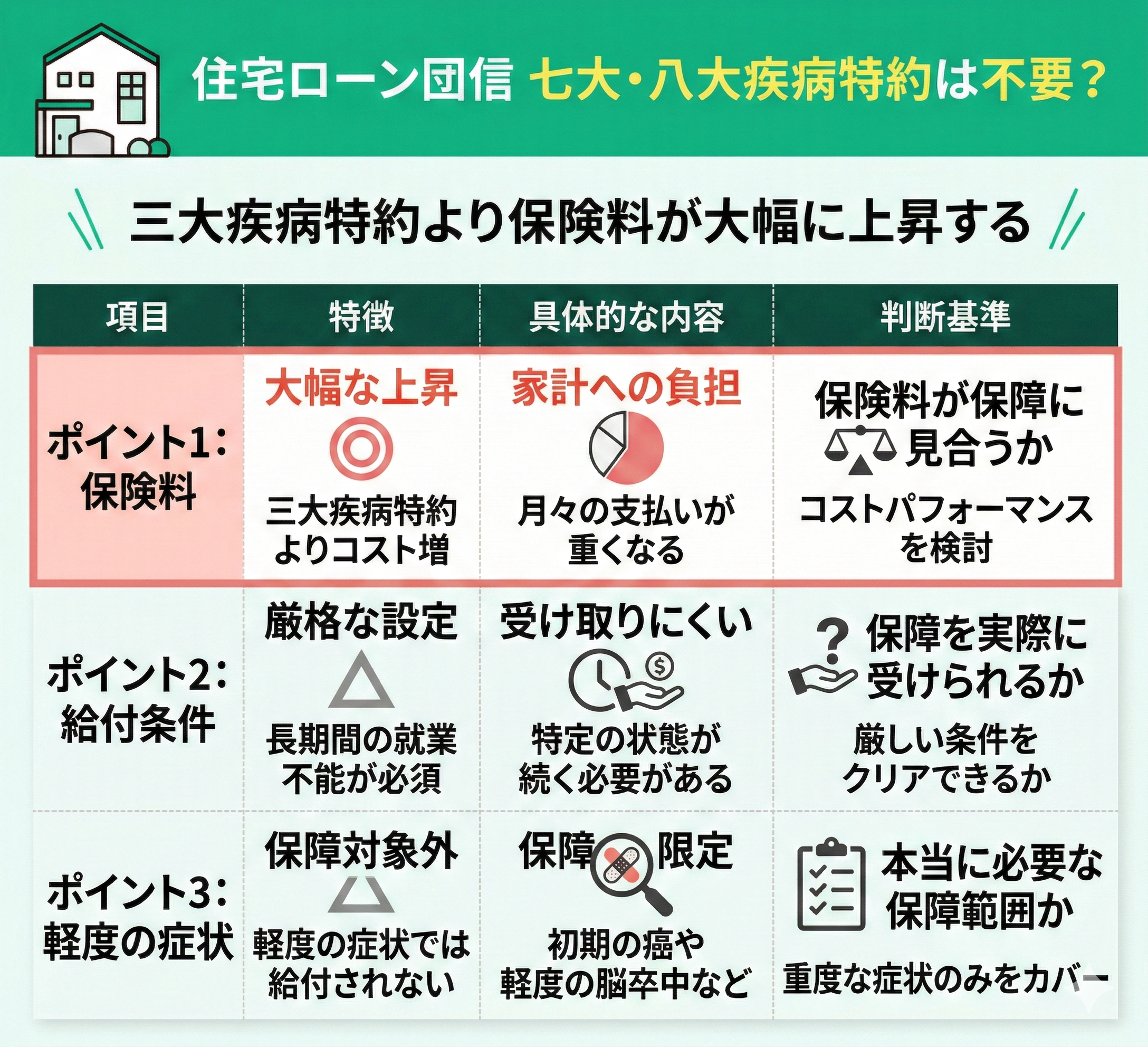 住宅ローン団信に七大・八大疾病特約を付ける際は、事前に理解しておくべきポイントとして以下4点に注意が必要です。