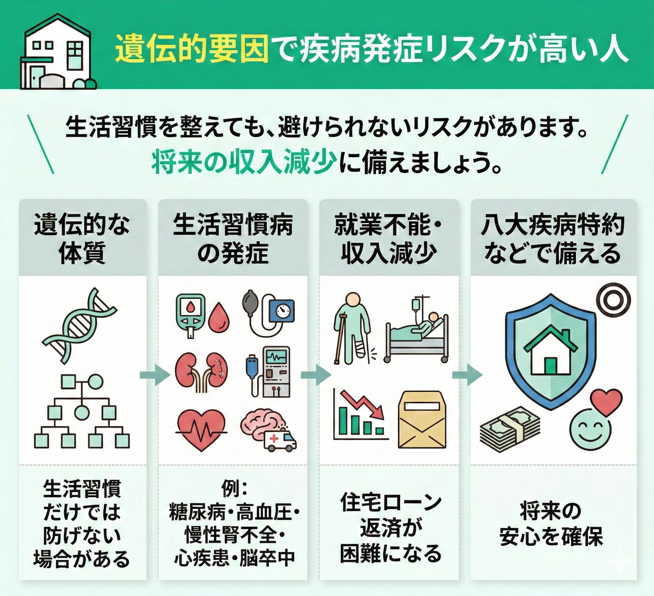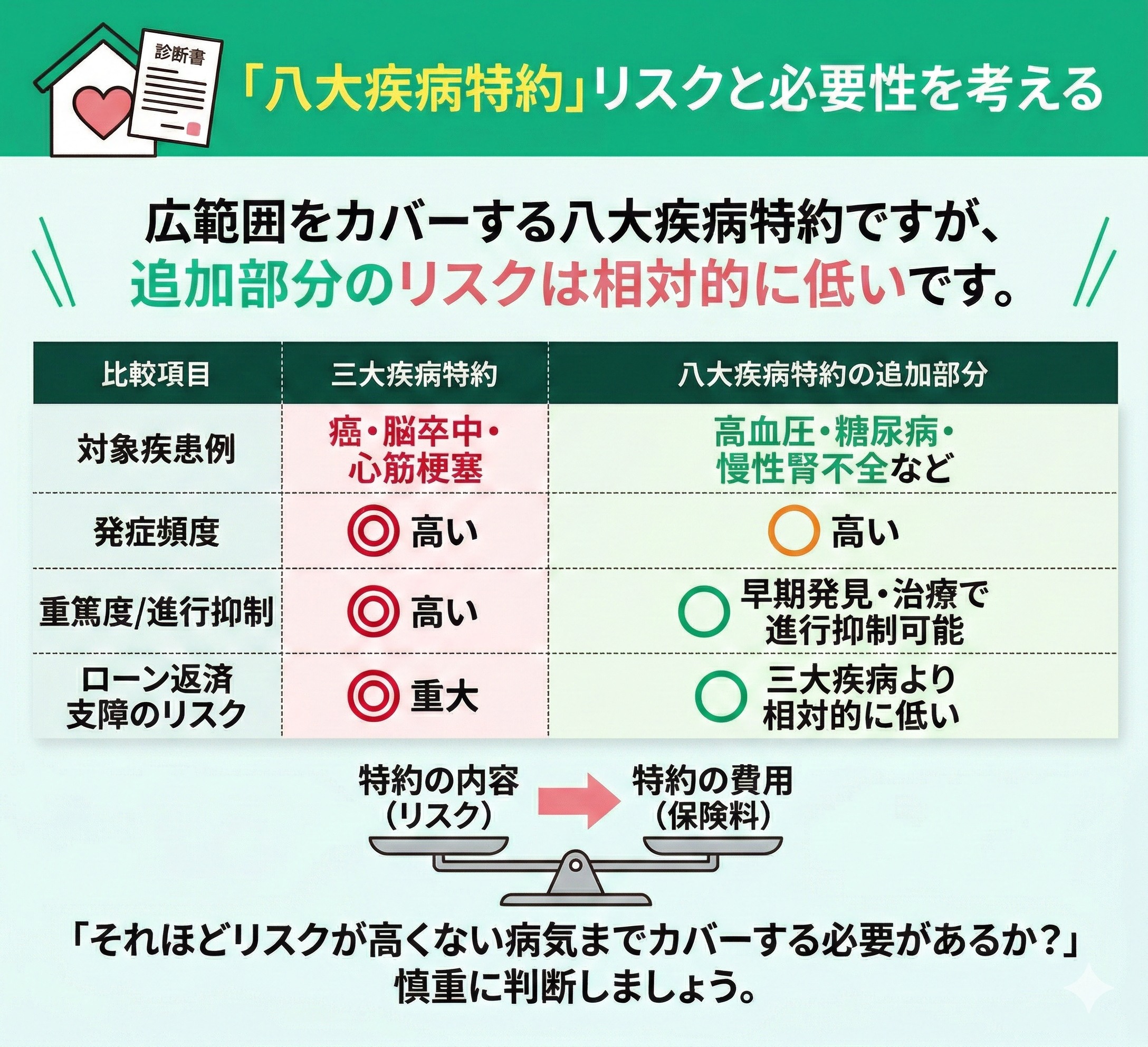 こうしたリスクに備える手段として、八大疾病特約は非常に有効です。