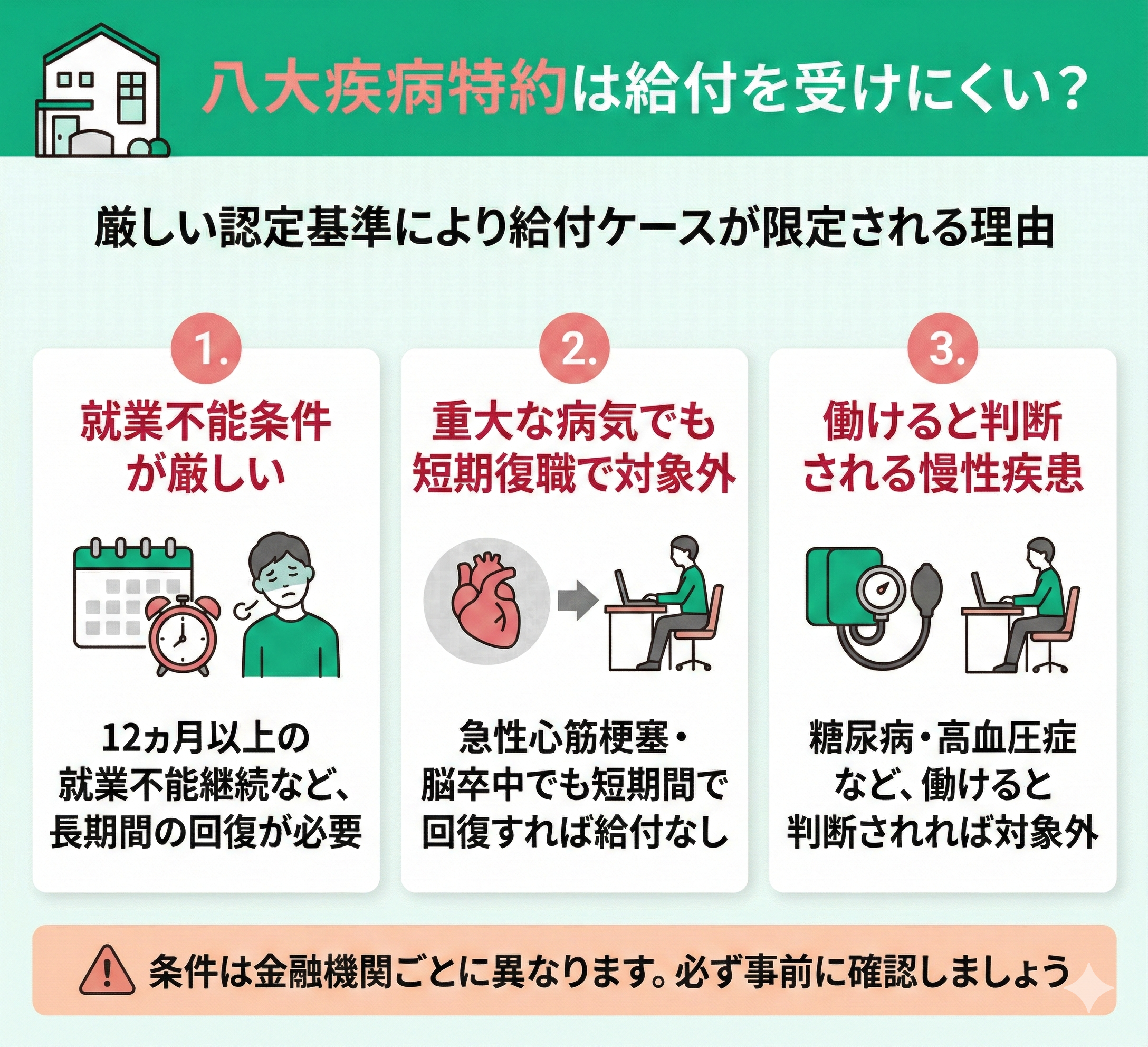 八大疾病特約の給付条件は、一般的に「就業不能状態が12ヵ月以上継続すること」など厳しく設定されています。
