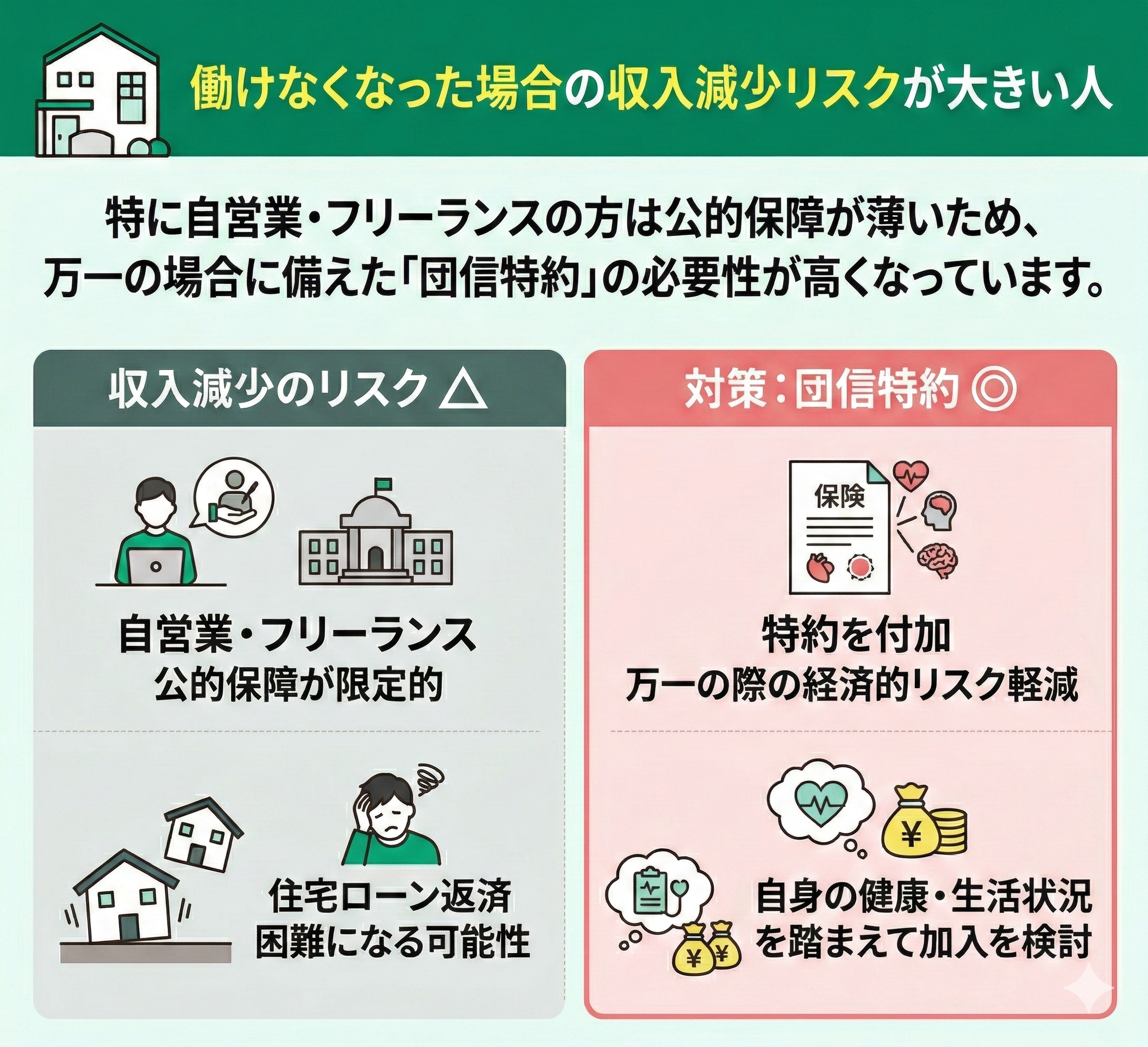 これらの要因に該当する方は、自身の健康状態や生活状況を踏まえ団信の特約加入を検討することが重要です。
