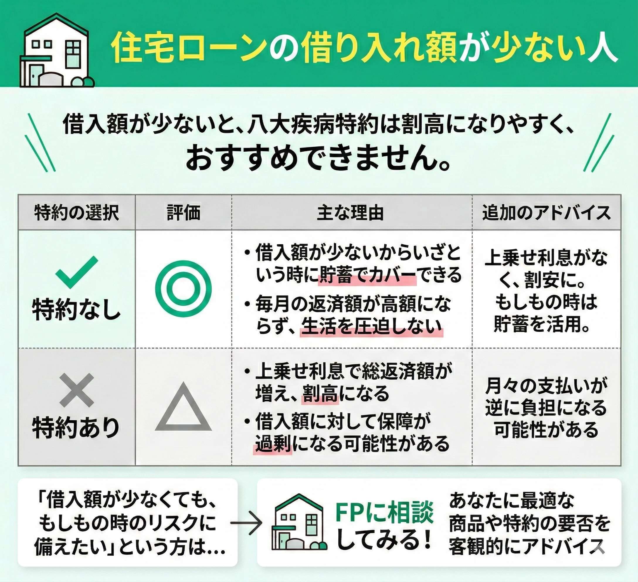 貯蓄状況に余裕がある方は、いざという時にも貯蓄でカバーが可能です。支払いに追われるリスクも回避できるため、特約で利息が上がってしまうのは逆に損をしてしまう場合もあります。