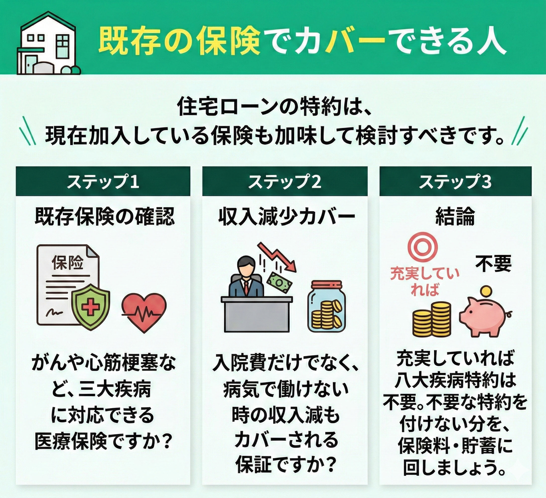 ある程度の貯蓄があり、1〜2ヶ月程度の収入減には耐えられるという方は、八大疾病特約をつけずに住宅ローンを契約するのもひとつの方法です。
