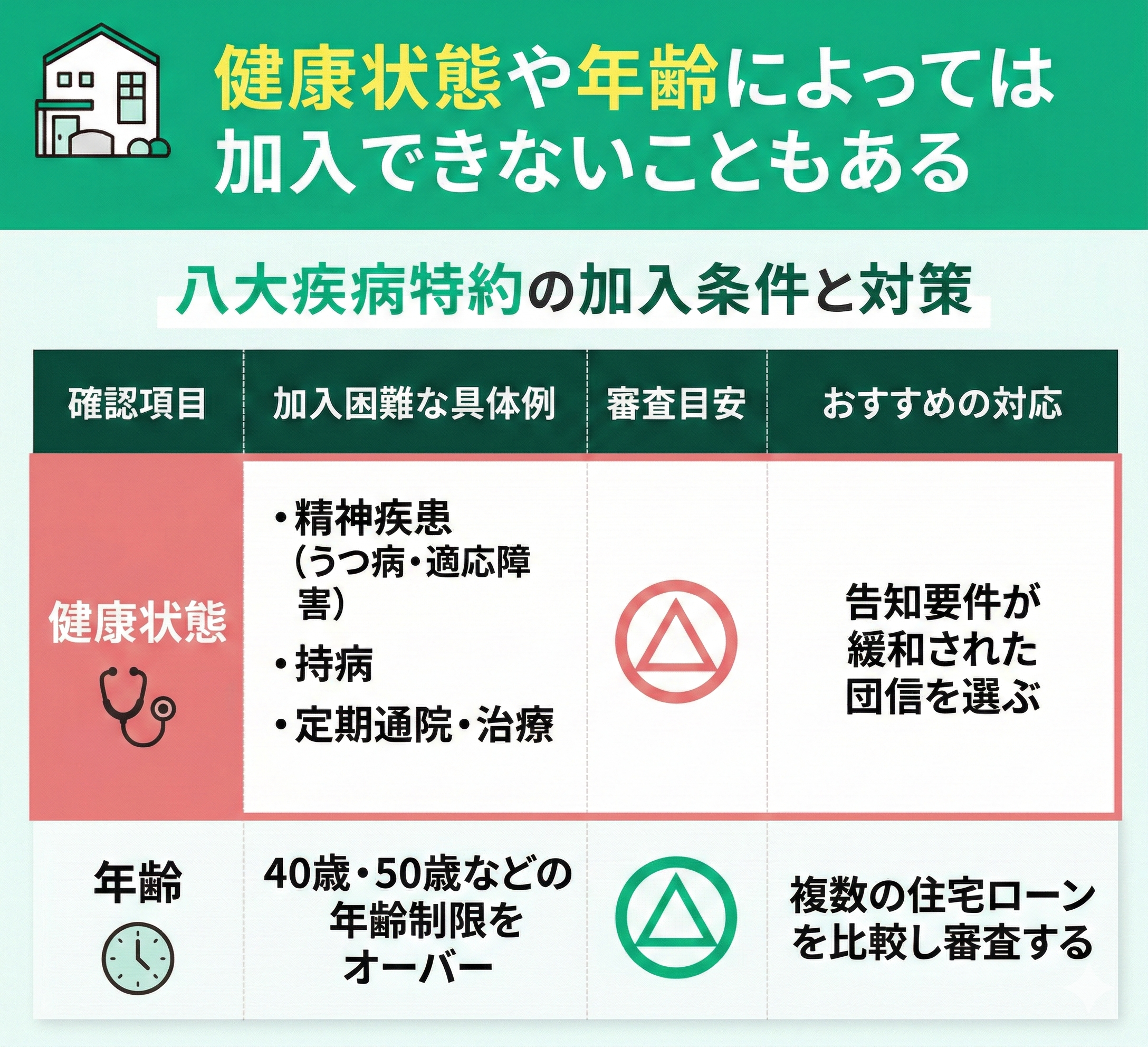 住宅ローンの八大疾病特約は、健康状態や年齢によっては加入できないこともあります。