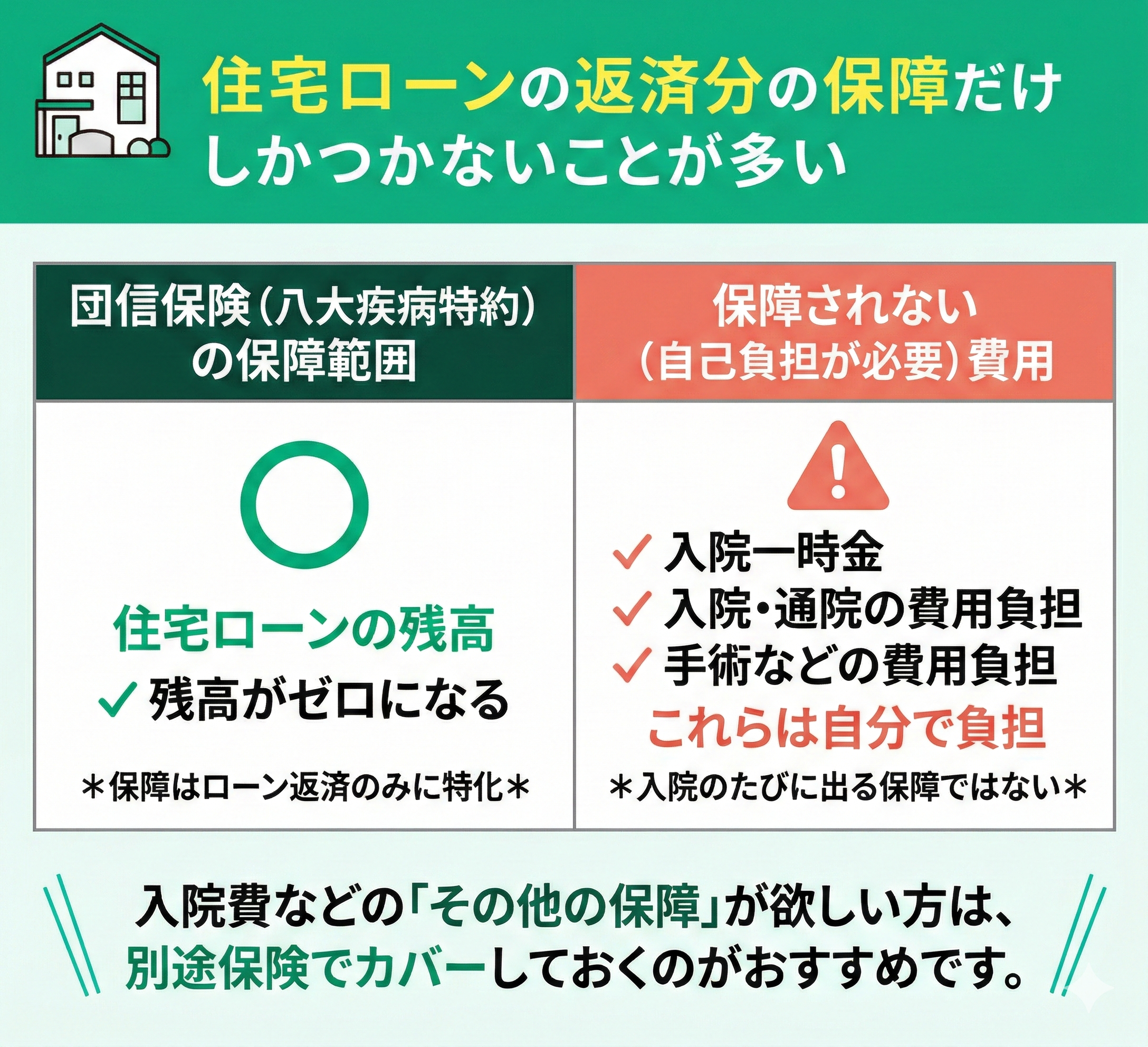 今の保険で足りるのか、特約をつけるべきか、といった疑問は、多くの方がつまずくポイントです。しかし、銀行や不動産会社では「心配ならつけるべき」といった表面的な回答になりがちで、ご自身の将来を見据えた具体的な提案はあまり期待できません。
