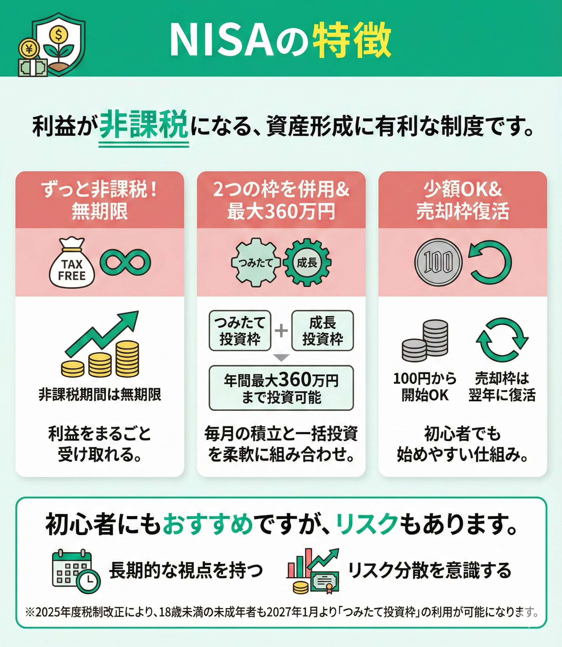 NISAは、株式や投資信託などで得た利益が非課税になる、資産形成に有利な制度で以下の特徴があります。
