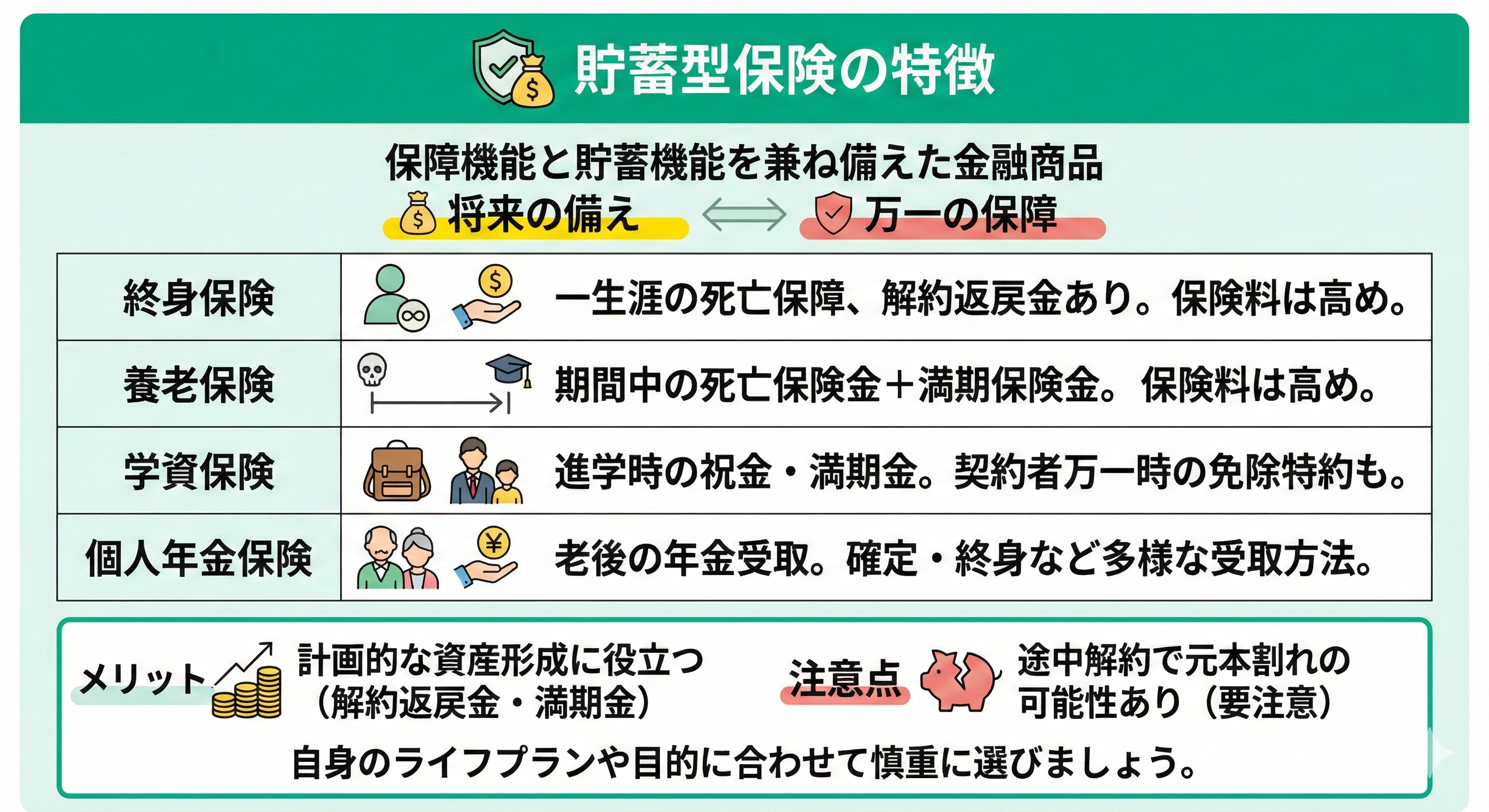 貯蓄型保険は、保障機能と貯蓄機能を兼ね備えた金融商品で、将来の資金需要に備えながら万一の保障も得られる特徴があります。