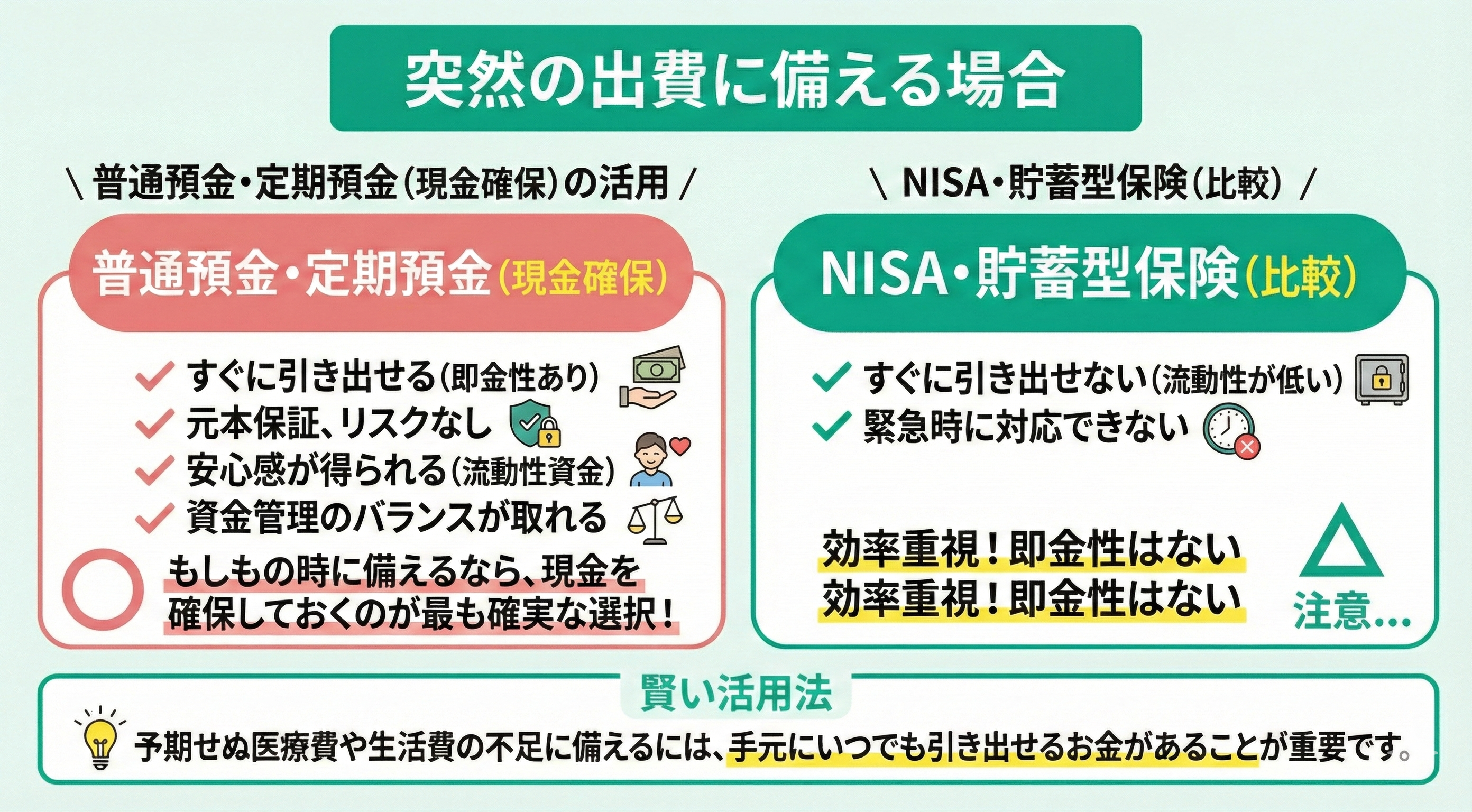 突然の出費に備えるには、普通預金や定期預金で現金を確保しておくことが最適です。