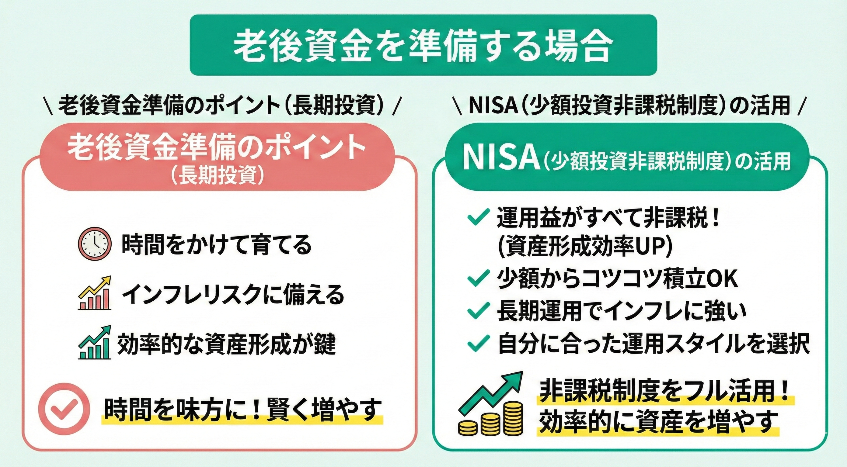 老後資金は時間をかけて育てることができるため、非課税制度を活かして効率的に資産を増やせる方法が適しています。