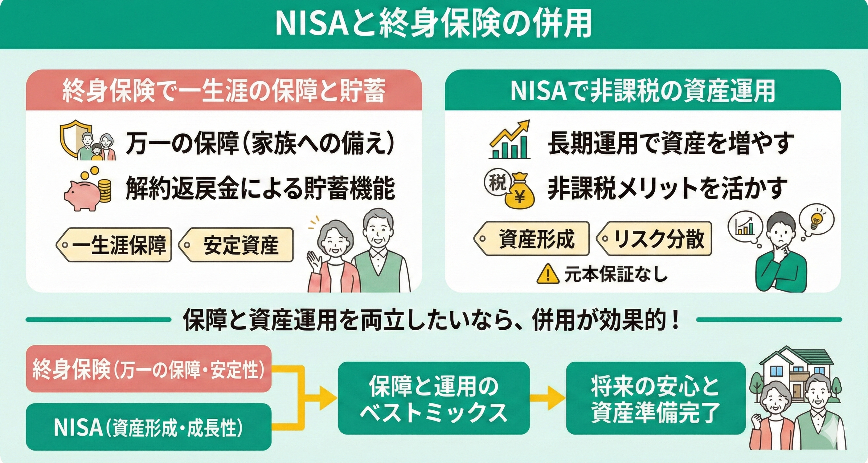 死亡保障と資産形成を同時に叶えたい方は、終身保険とNISAの併用が効果的です。