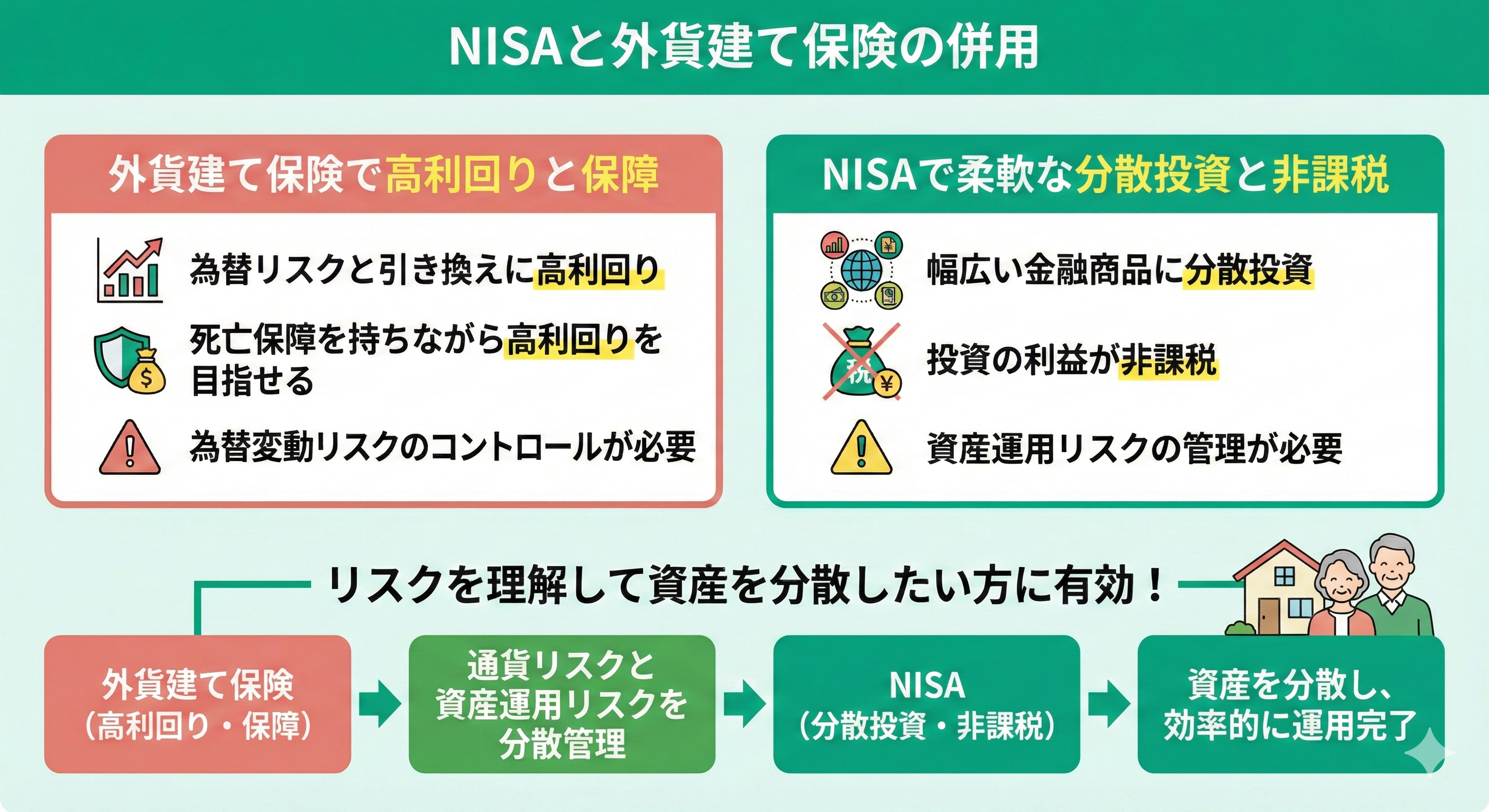 外貨建て保険は為替リスクと引き換えに高利回りを期待でき、NISAは投資の利益を非課税にできる制度です。