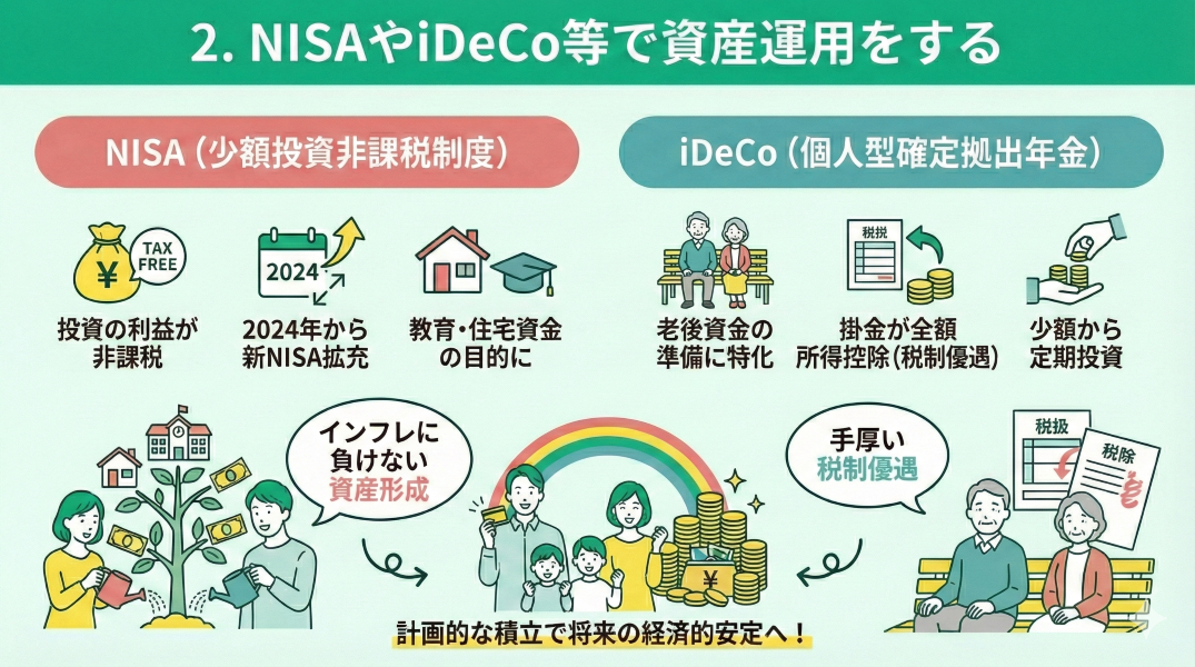 特に税制優遇のあるNISA(少額投資非課税制度)やiDeCo(個人型確定拠出年金)を活用することで、効率的な資産運用が可能になります。