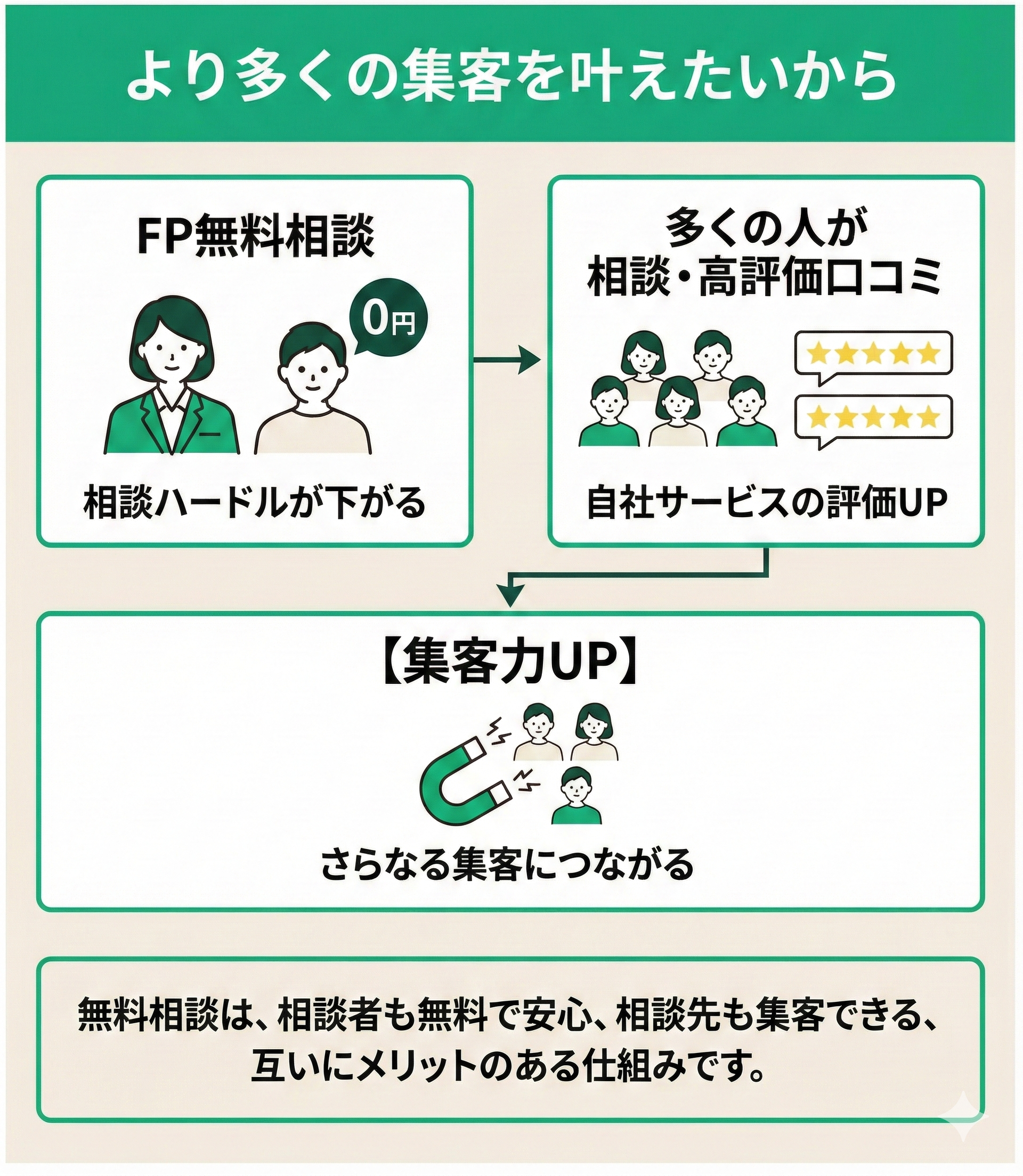 無料にすることで相談へのハードルを下げ、より多くの人々に相談していただき、高評価の口コミをたくさんいただくことで、自社サービスのさらなる集客につながります。