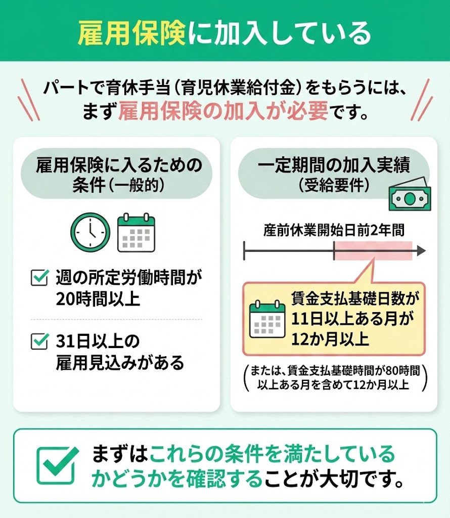 パートで育休手当(育児休業給付金)をもらうには、まずは雇用保険の加入が必要です。