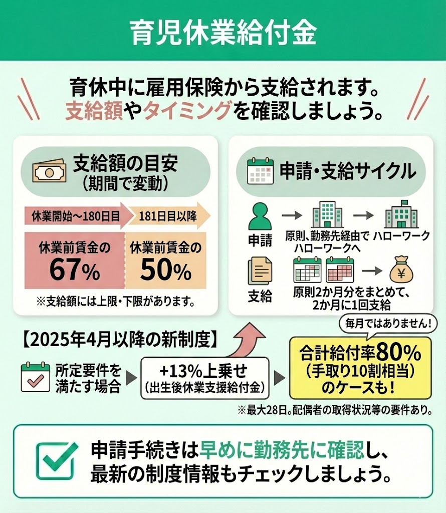 なお、2025年4月以降は所定の要件を満たす場合、出生後休業支援給付金(休業前賃金の13%)が最大28日上乗せされ、育児休業給付金等と合わせて給付率が80%(手取り10割相当)となるケースがあります。 ※上乗せは配偶者の育休取得状況等の要件を満たす場合に限られます。