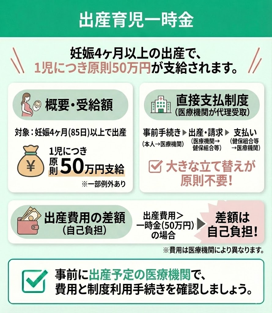 そのため、事前に出産予定の医療機関で直接支払制度の利用手続きを行っておけば、原則としてあらためて大きな金額を立て替える必要はありません(差額が発生する場合は自己負担となります)。