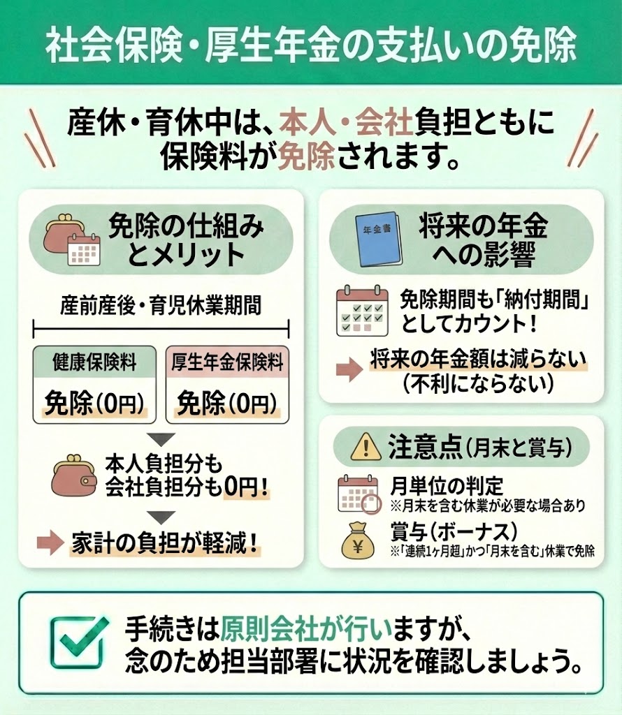 産前産後休業・育児休業の期間中は、勤務先の社会保険(健康保険・厚生年金)に加入している場合、社会保険料と厚生年金保険料が免除されます。本人負担分だけでなく、事業主負担分も免除されるのがポイントです。