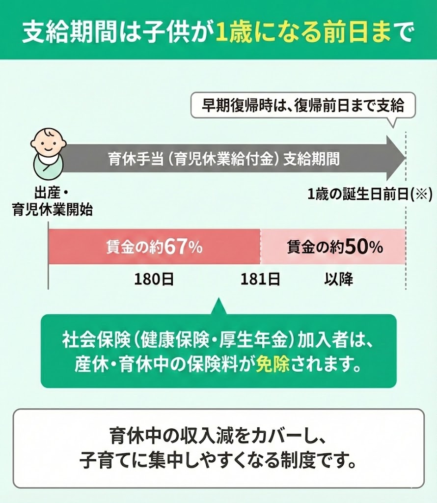 ※制度改正により、近年は育休中だけでなく、復帰後(時短勤務等)を支える制度も拡充しています。詳細は後ほど解説します。