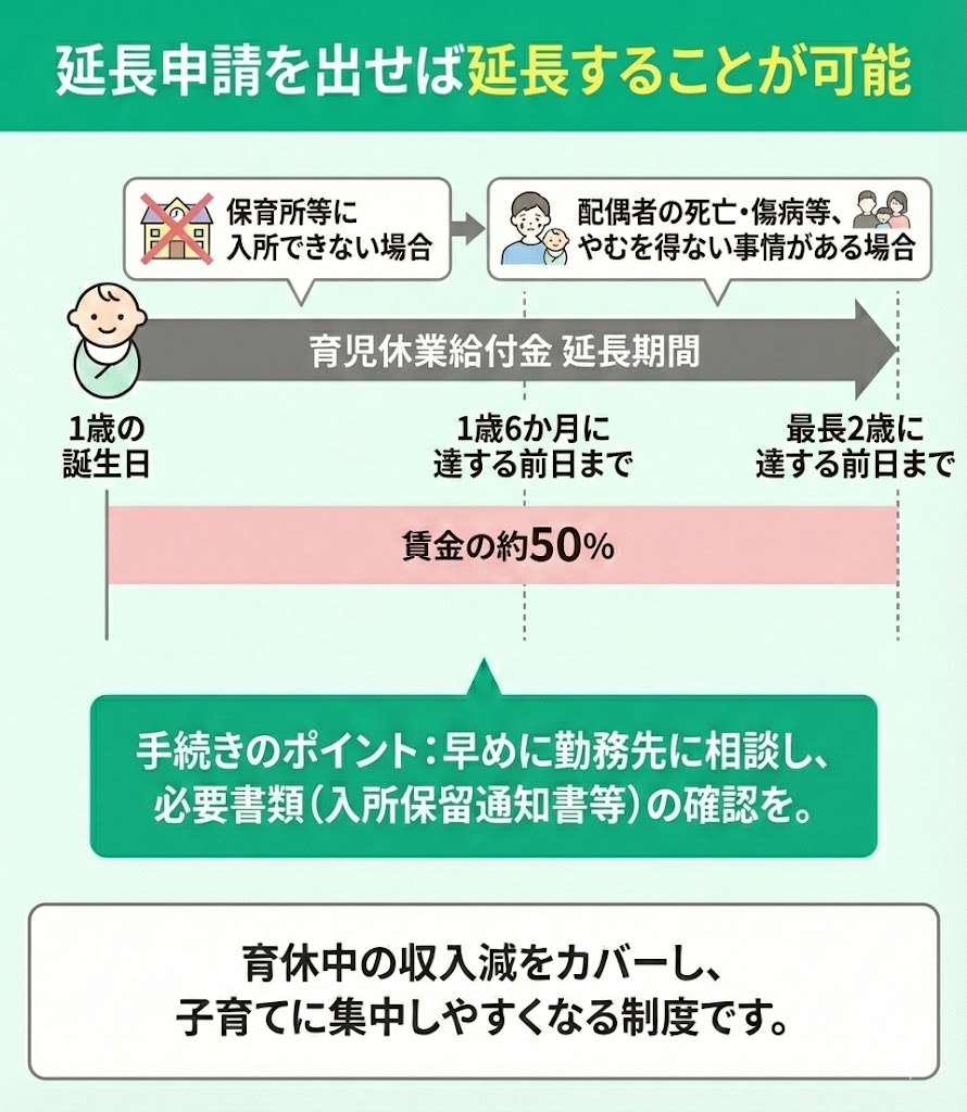 延長が認められた場合、支給期間は子が1歳6か月に達する日の前日まで延長され、さらに延長が必要な場合は、最長で2歳に達する前日まで延長が可能です。