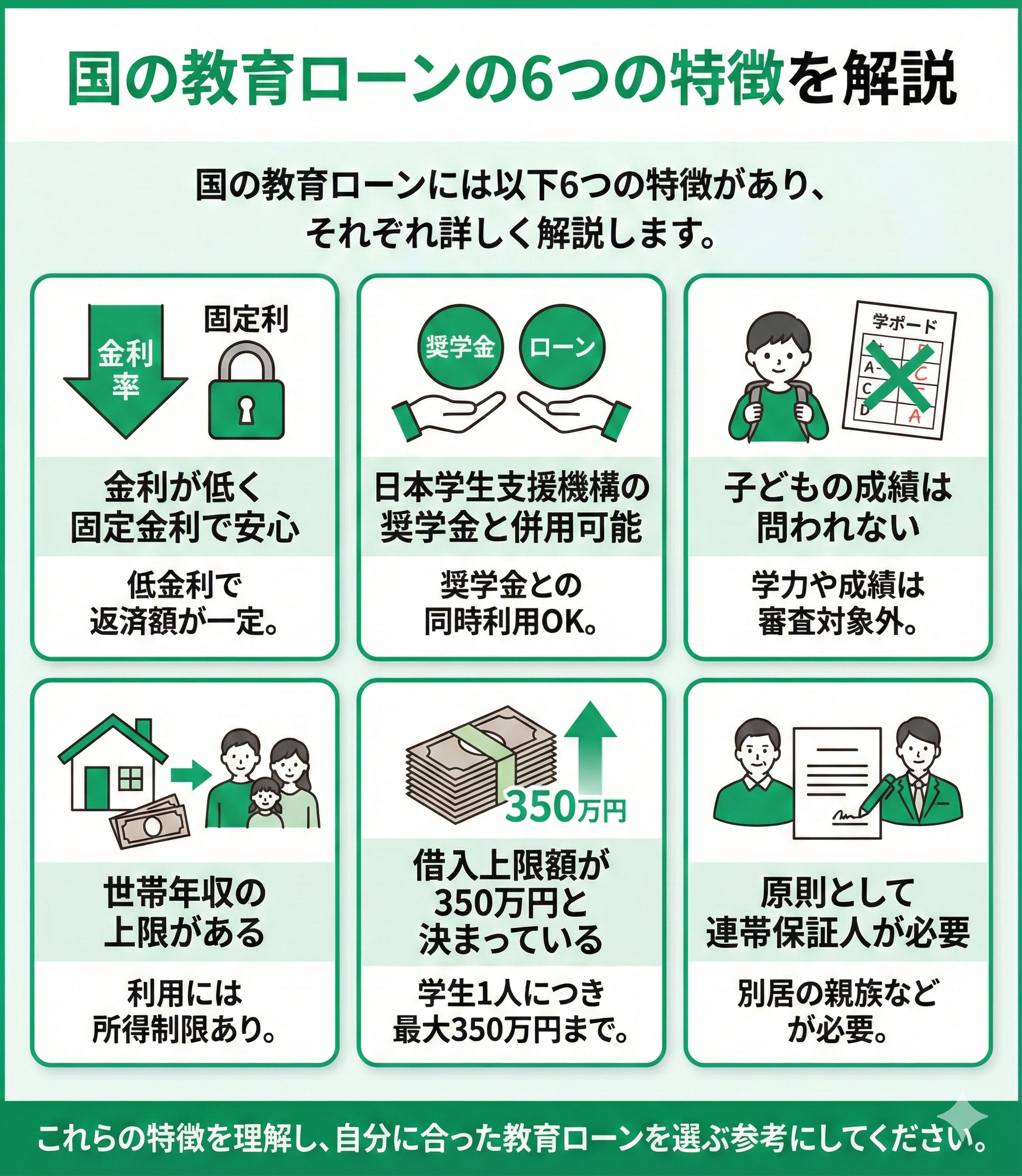 国の教育ローンには以下6つの特徴があり、それぞれ詳しく解説します。