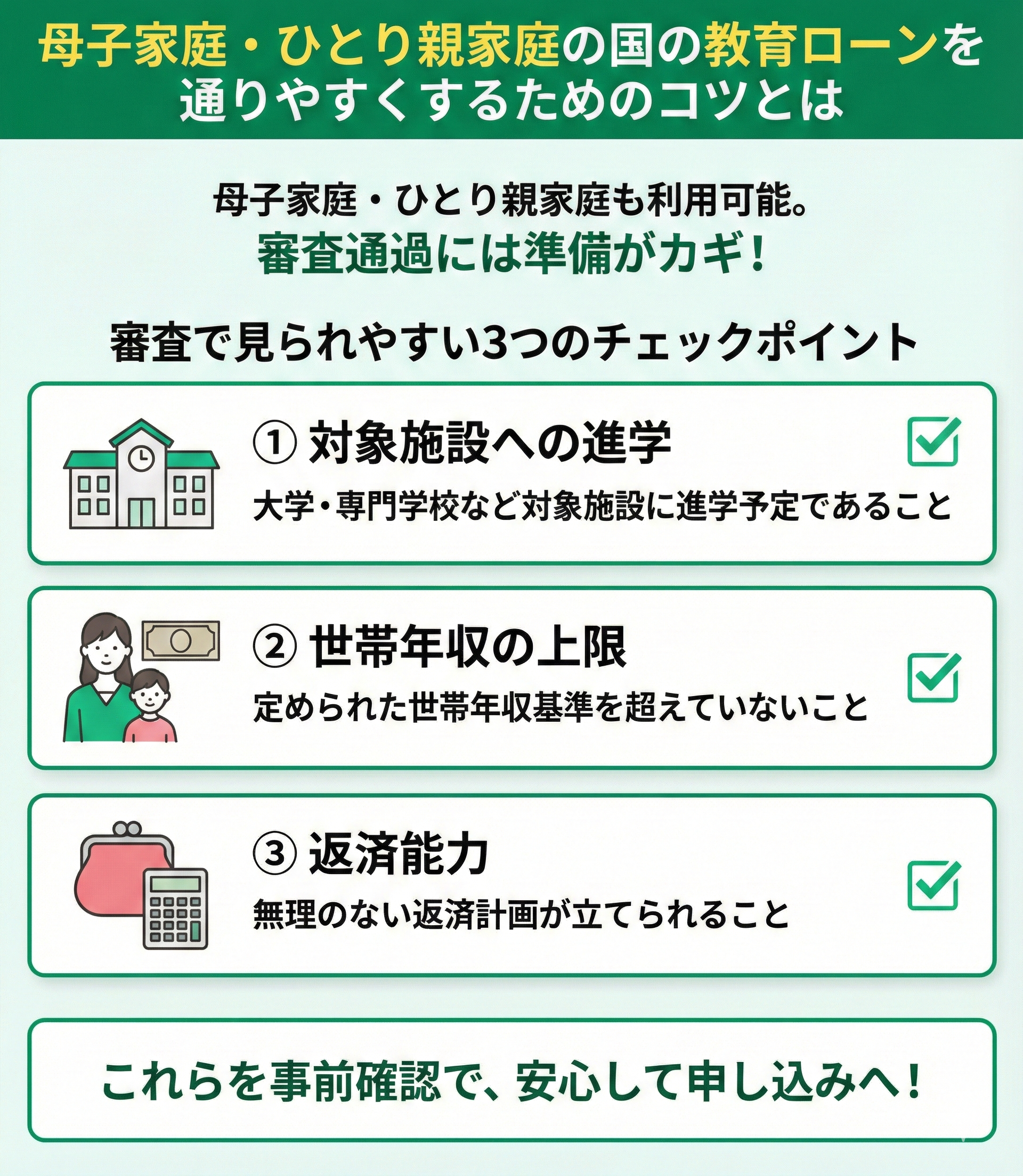 国の教育ローンは、返済能力や所得制限などの審査基準を満たせば、母子家庭やひとり親家庭でも利用可能です。